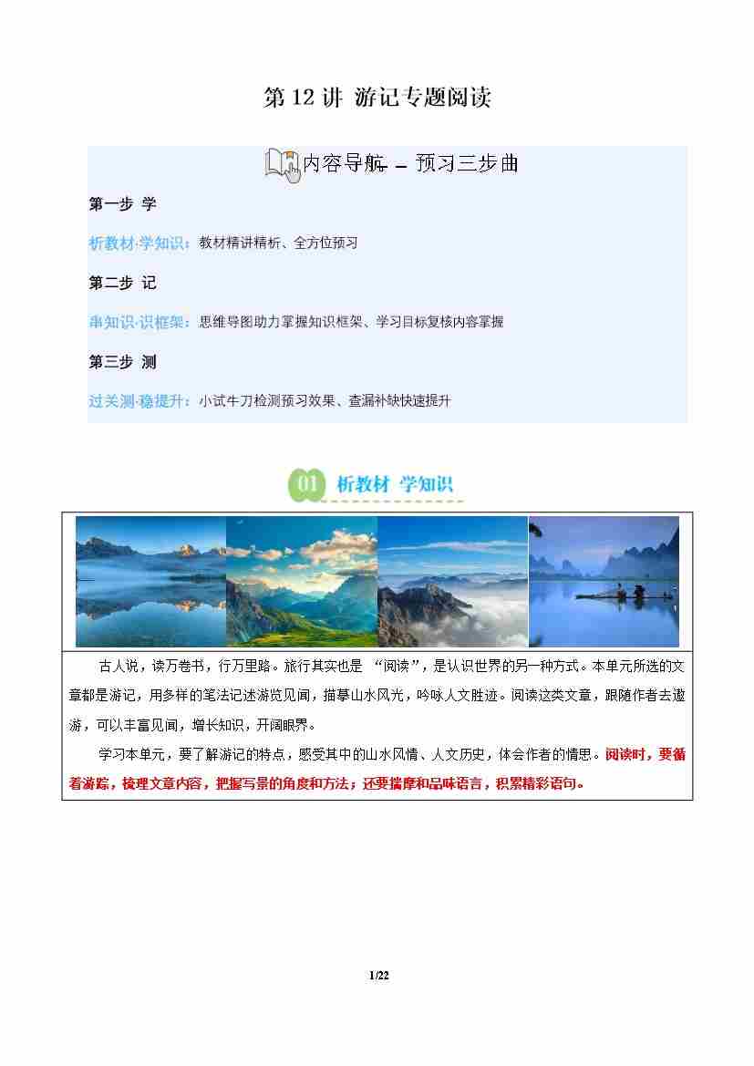 ②寒假预习-第12讲 游记专题阅读(寒假预习讲义)(学生版)-2026学年八年级语文寒假衔接讲练(统编版-新教材)