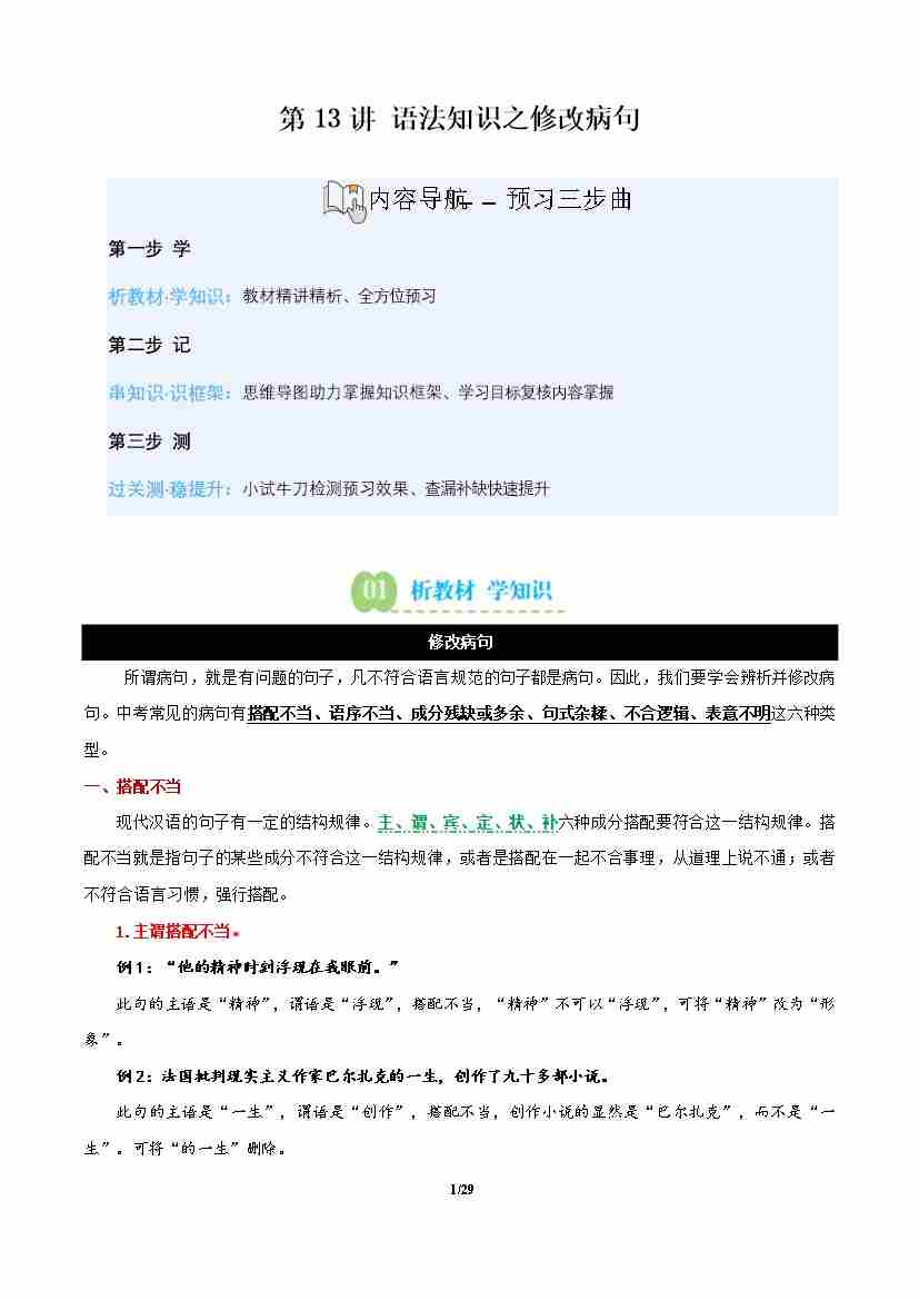 ②寒假预习-第13讲 语法知识之修改病句(寒假预习讲义)(学生版)-2026学年八年级语文寒假衔接讲练(统编版-新教材)