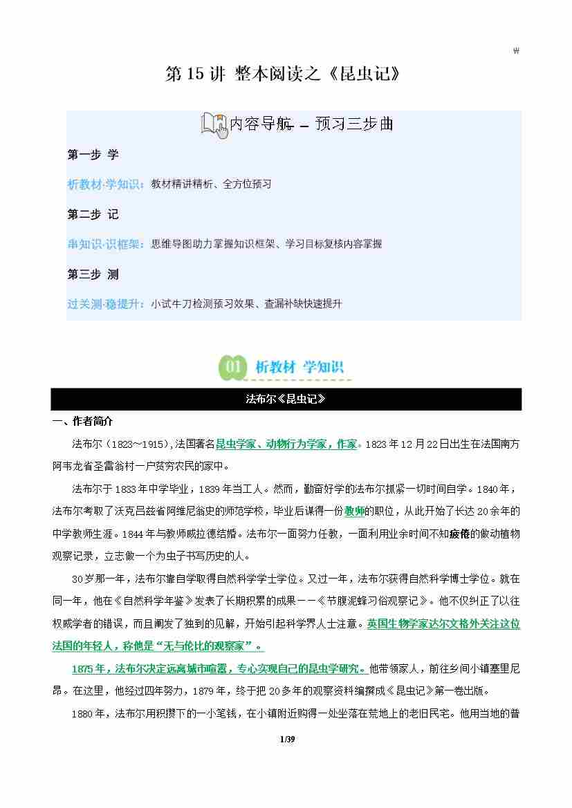 ②寒假预习-第15讲 整本阅读之《昆虫记》(寒假预习讲义)(教师版)-2026学年八年级语文寒假衔接讲练(统编版-新教材)