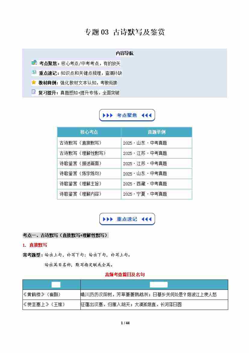①寒假复习-专题03 古诗默写及鉴赏(寒假复习讲义)(学生版)-2026学年八年级语文寒假衔接讲练(统编版-新教材)