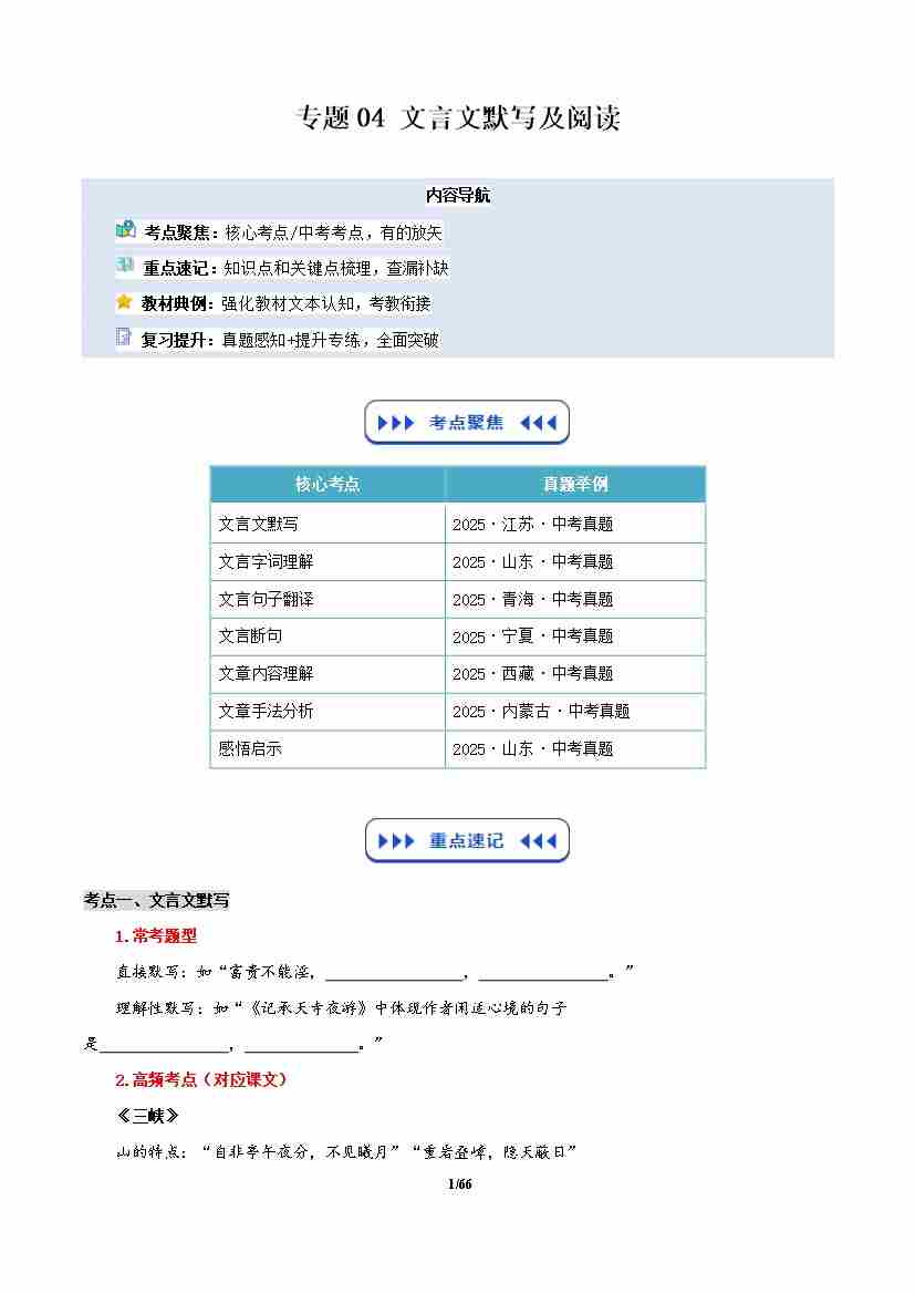 ①寒假复习-专题04 文言文默写及阅读(寒假复习讲义)(学生版)-2026学年八年级语文寒假衔接讲练(统编版-新教材)