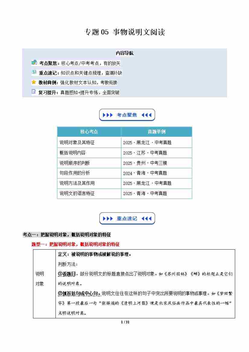 ①寒假复习-专题05 事物说明文阅读(寒假复习讲义)(教师版)-2026学年八年级语文寒假衔接讲练(统编版-新教材)