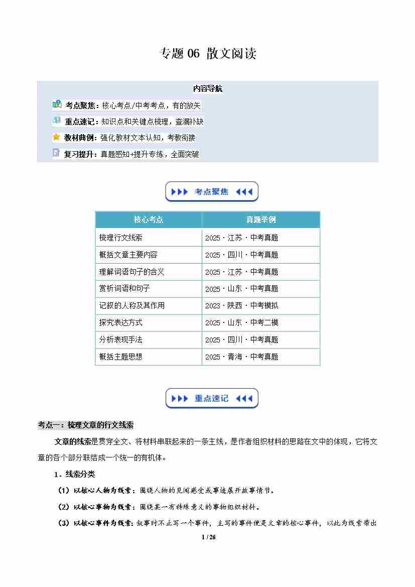 ①寒假复习-专题06 散文阅读(寒假复习讲义)(教师版)-2026学年八年级语文寒假衔接讲练(统编版-新教材)