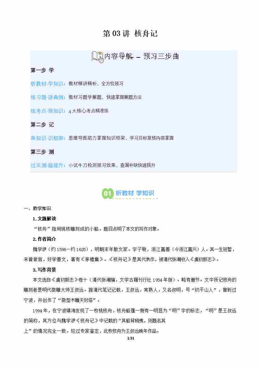 ②寒假预习-第03讲 《核舟记》(寒假预习讲义)(学生版)-2026学年八年级语文寒假衔接讲练(统编版-新教材)