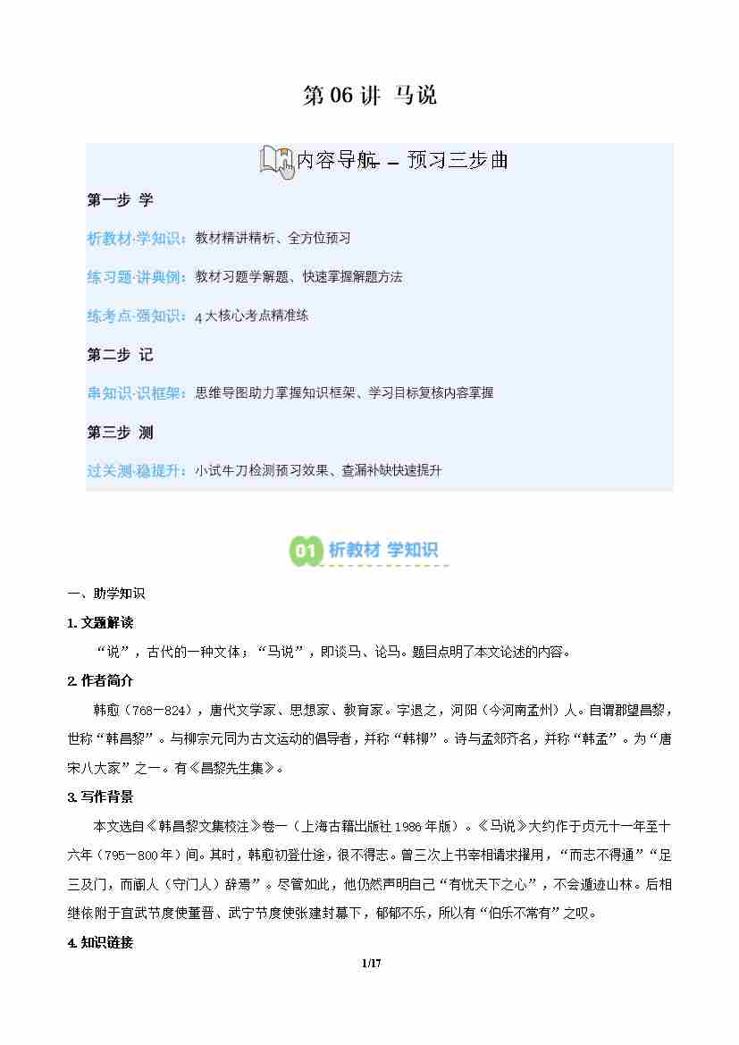 ②寒假预习-第06讲 《马说》(寒假预习讲义)(学生版)-2026学年八年级语文寒假衔接讲练(统编版-新教材)
