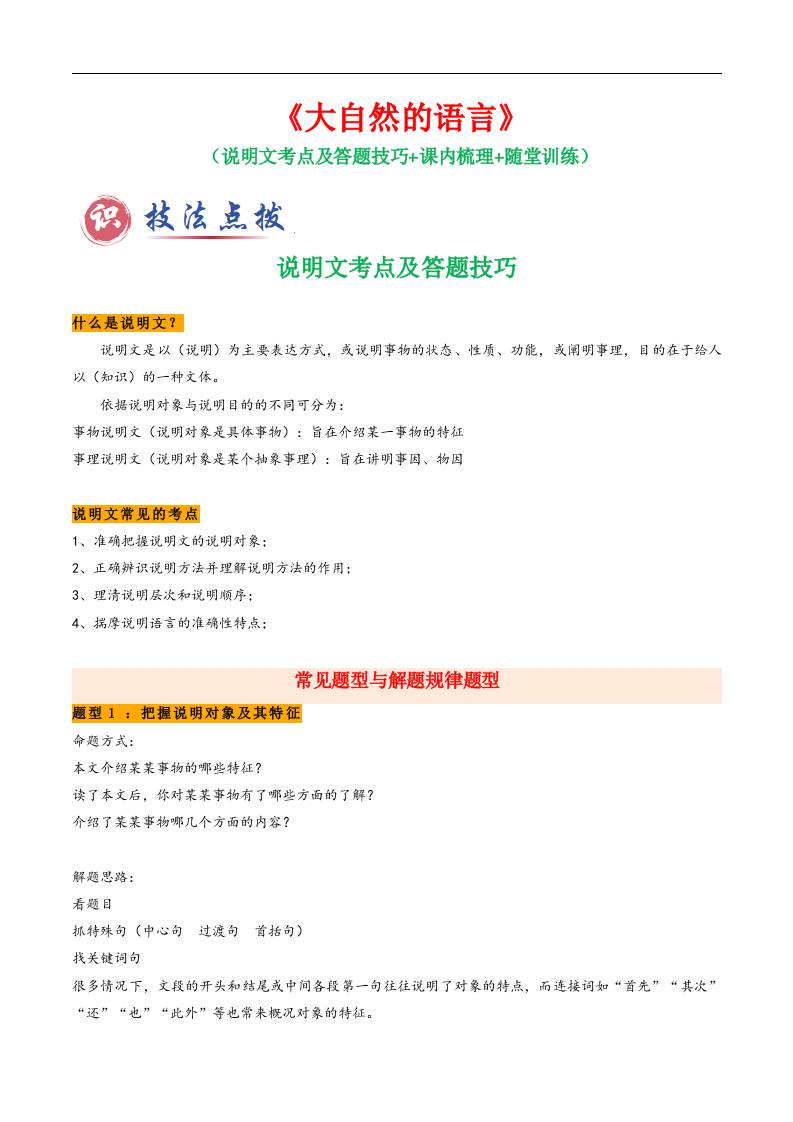 《大自然的语言》(说明文考点及答题技巧课内梳理随堂训练)解析版