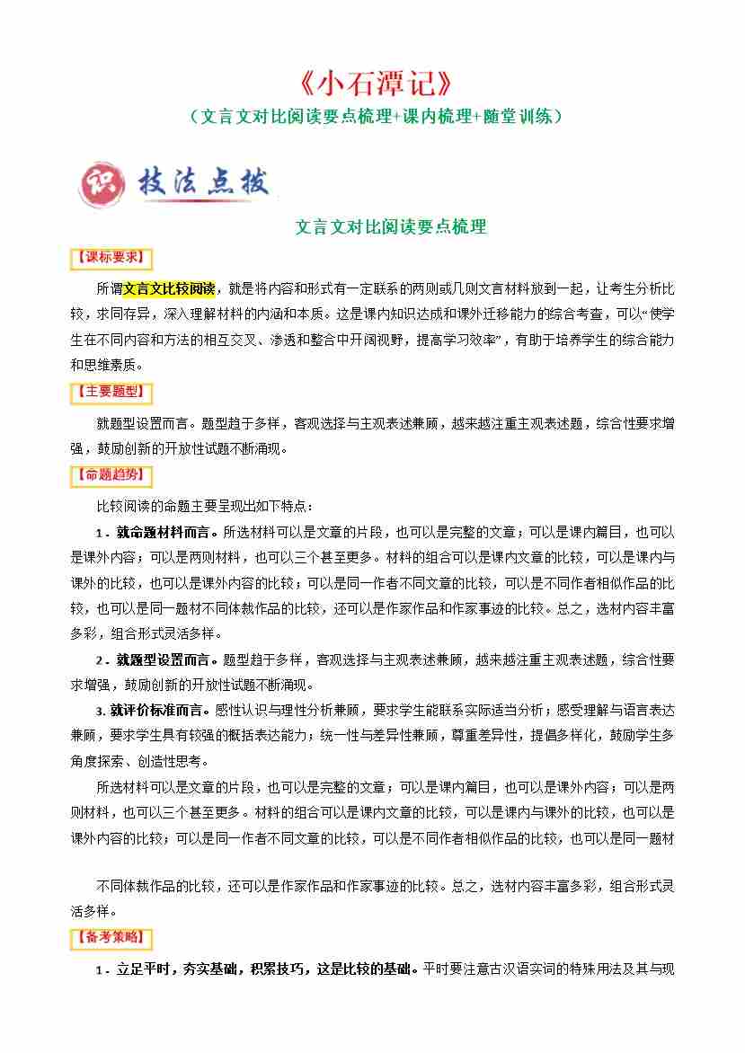 《小石潭记》(文言文对比阅读要点梳理 课内梳理 随堂训练)解析版