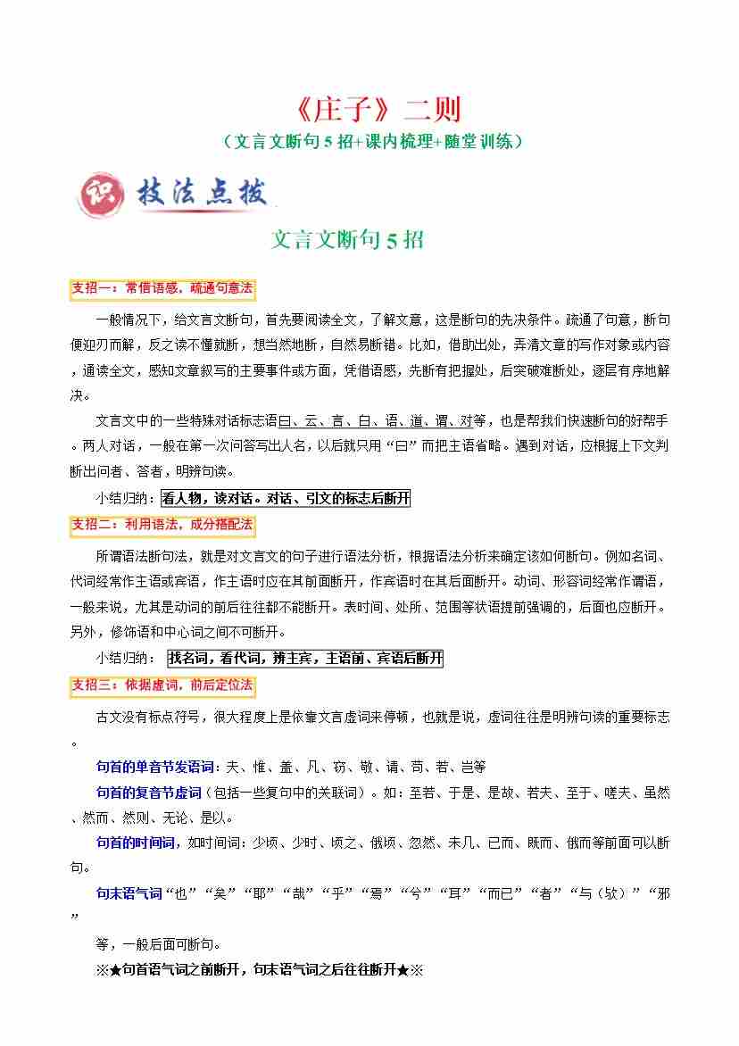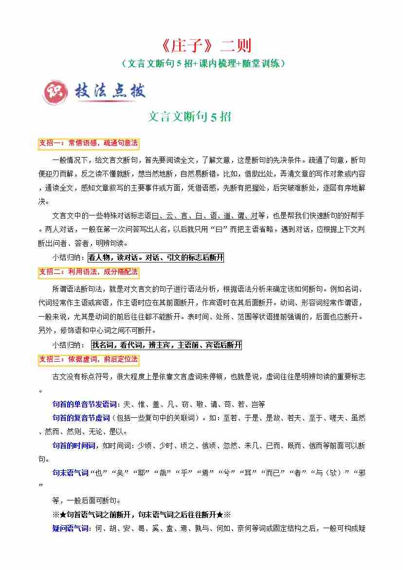《庄子》二则(文言文断句5招 课内梳理 随堂训练)解析版