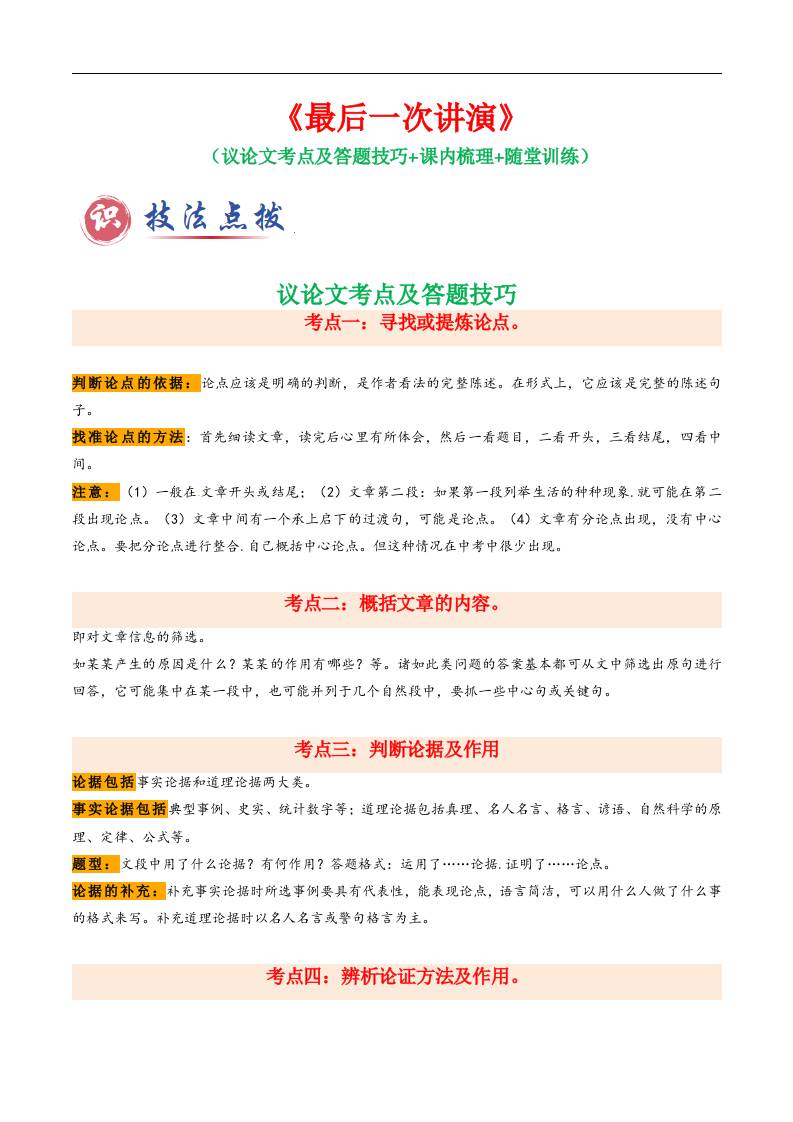 《最后一次讲演》(议论文考点及答题技巧课内梳理随堂训练)原卷版