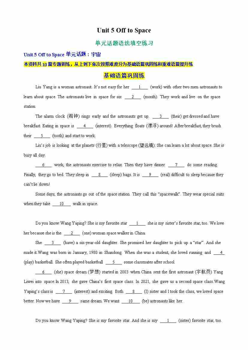 Unit 5 Off to Space 单元话题语法填空练习(学生版)