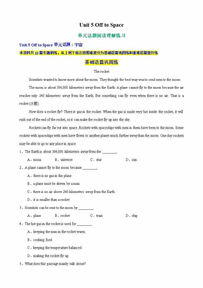 Unit 5 Off to Space 单元话题阅读理解练习(教师版)