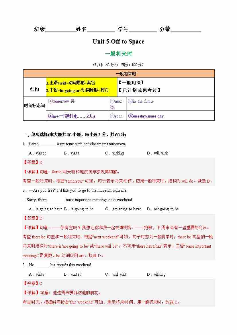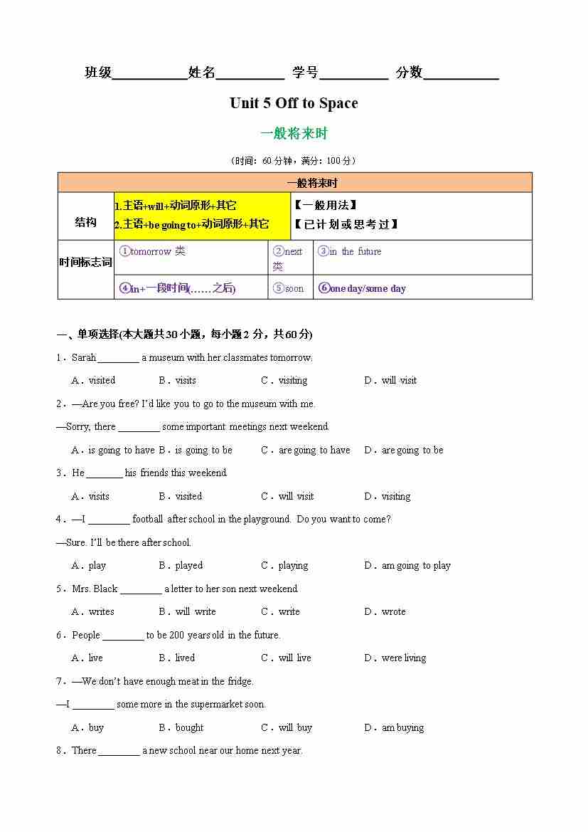 Unit 5 Off to Space 语法Grammar 一般将来时(教师版)