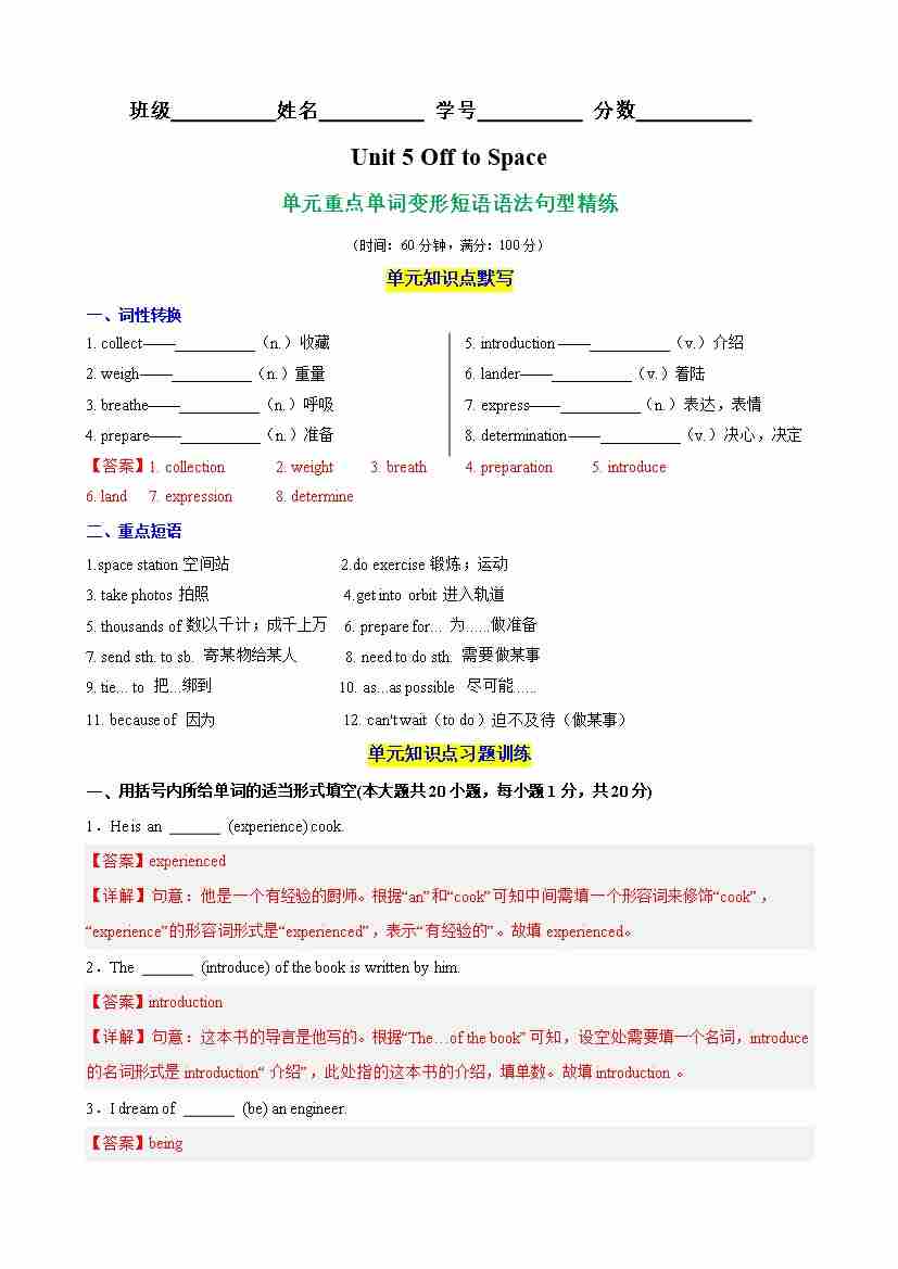 Unit 5 Off to Space单元重点单词,词性转换,短语,语法,句型精练(教师版)