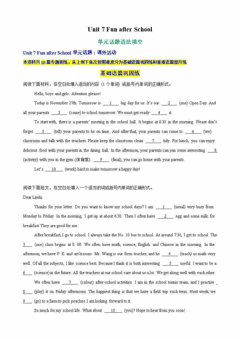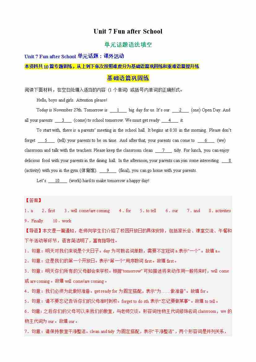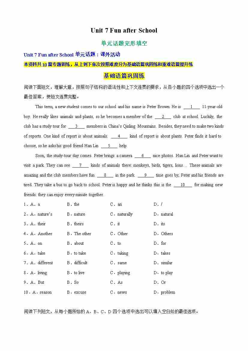 Unit 7 Fun after School单元话题语法填空练习(解析版)
