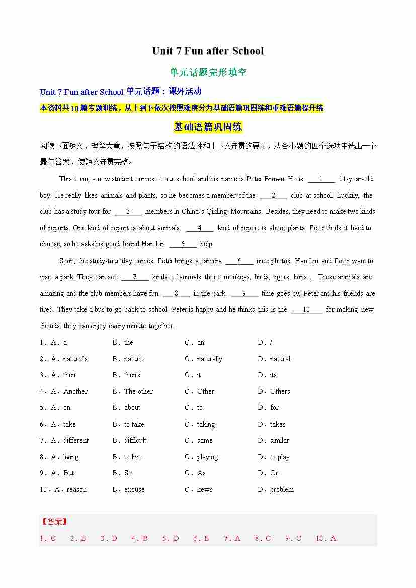 Unit 7 Fun after School单元话题完形填空练习(解析版)