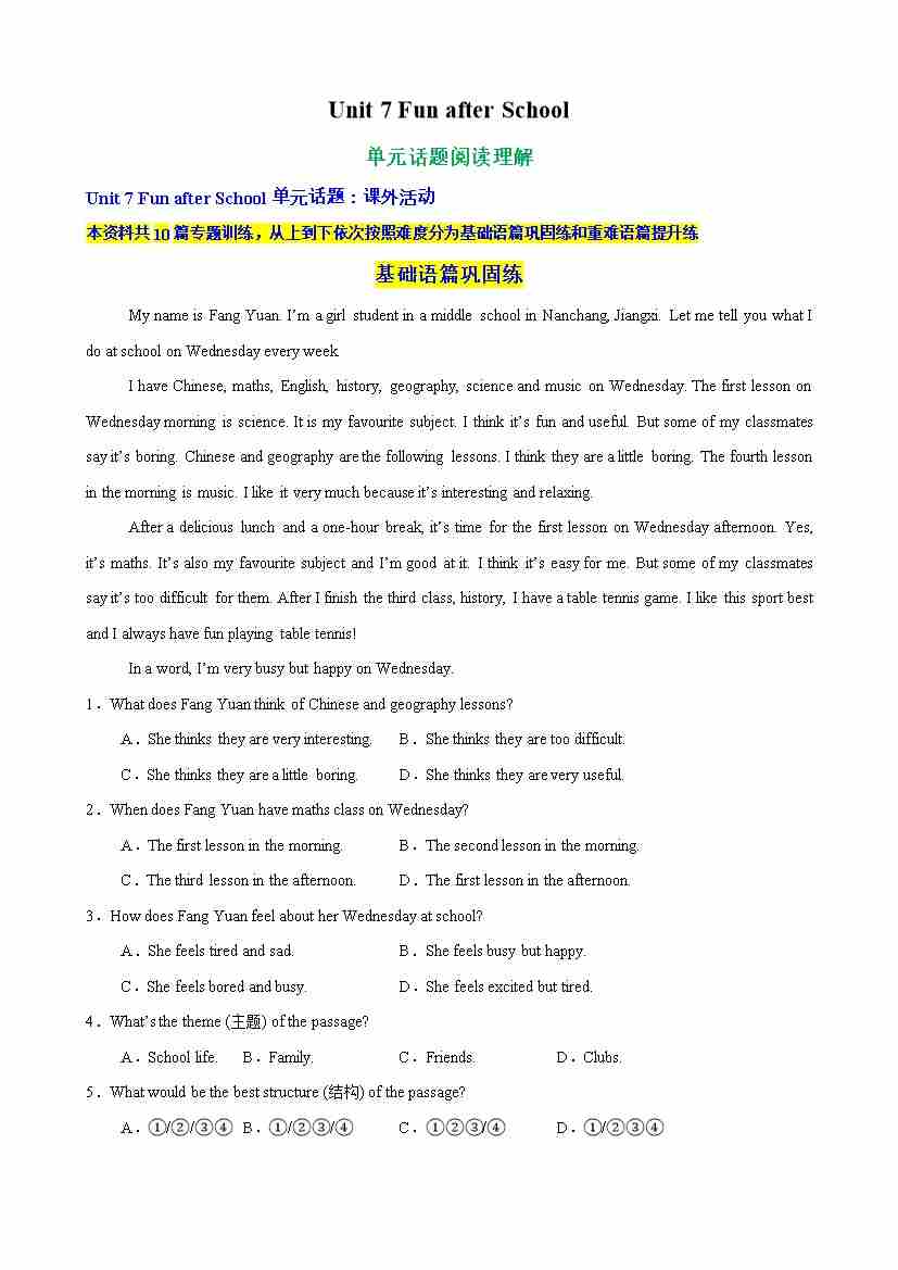 Unit 7 Fun after School单元话题阅读理解练习(解析版)