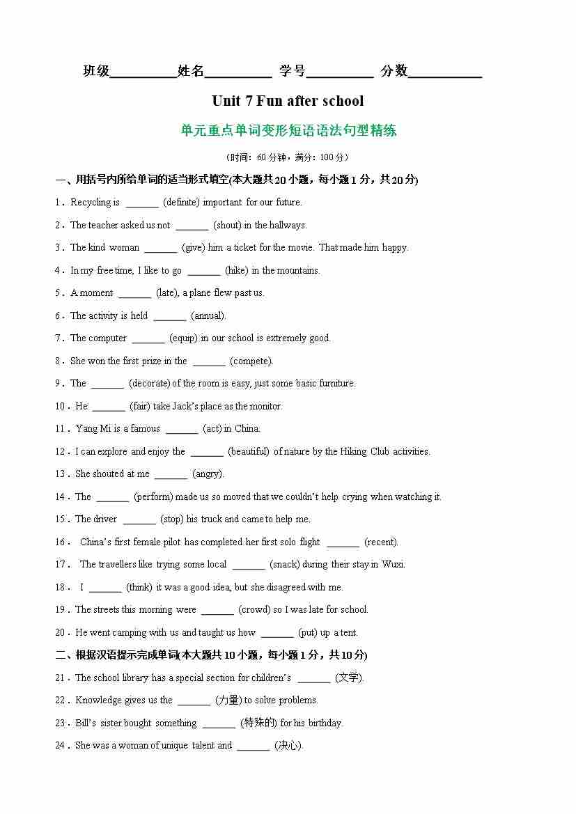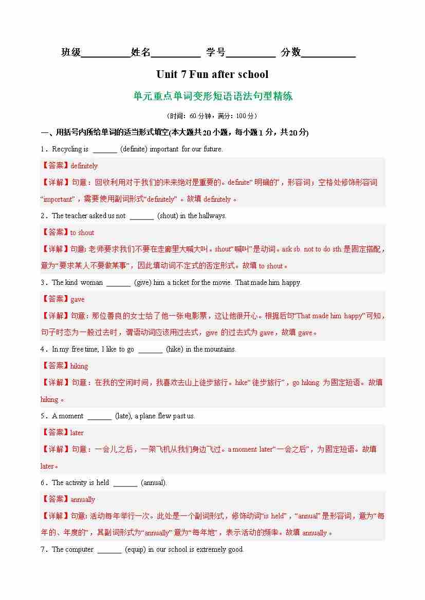 Unit 7 Fun after school重点单词,词性转换,短语,语法,句型练习(解析版)