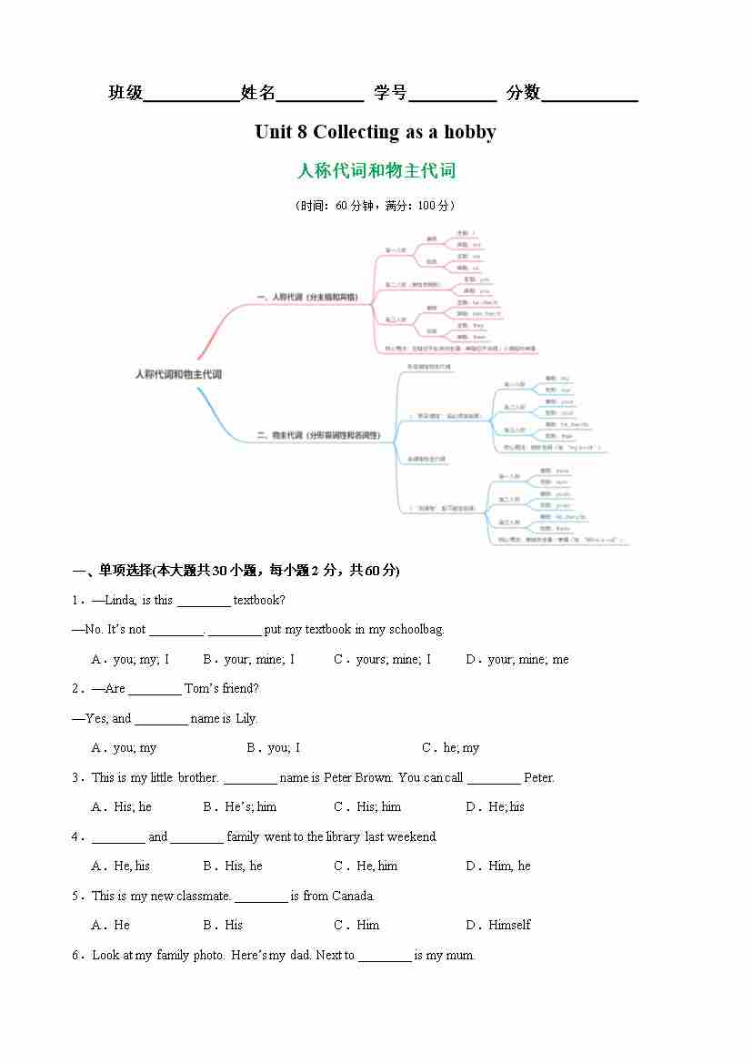 Unit 8 Collecting as a hobby 语法Grammar 人称代词和物主代词(原卷版)