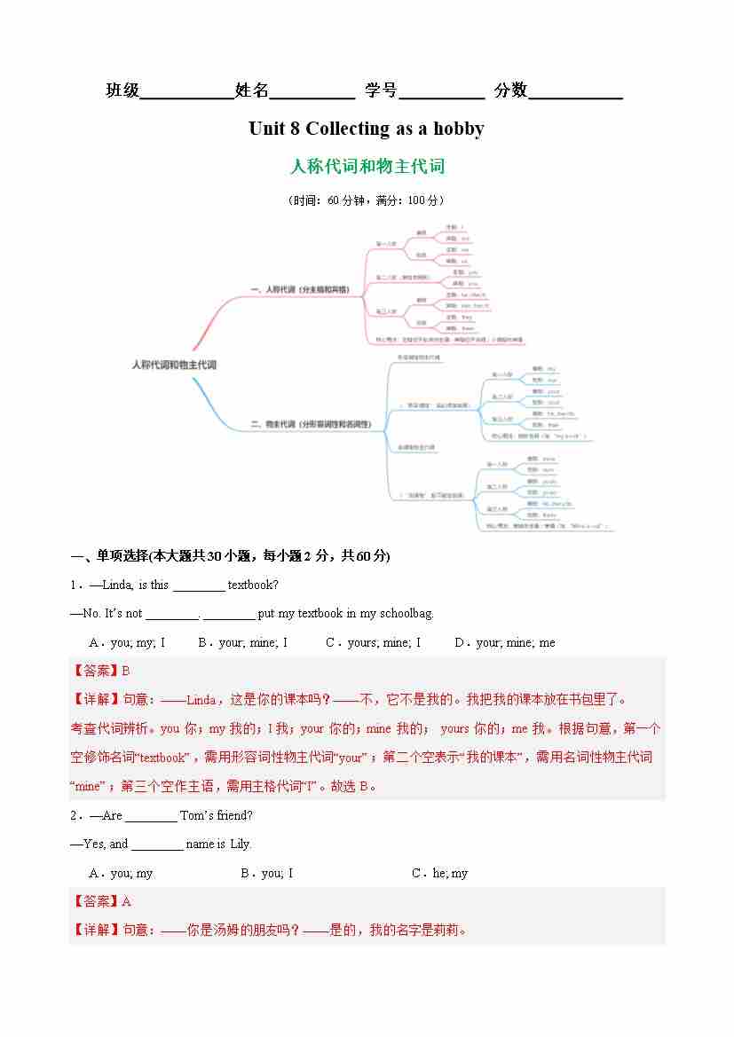 Unit 8 Collecting as a hobby 语法Grammar 人称代词和物主代词(解析版)