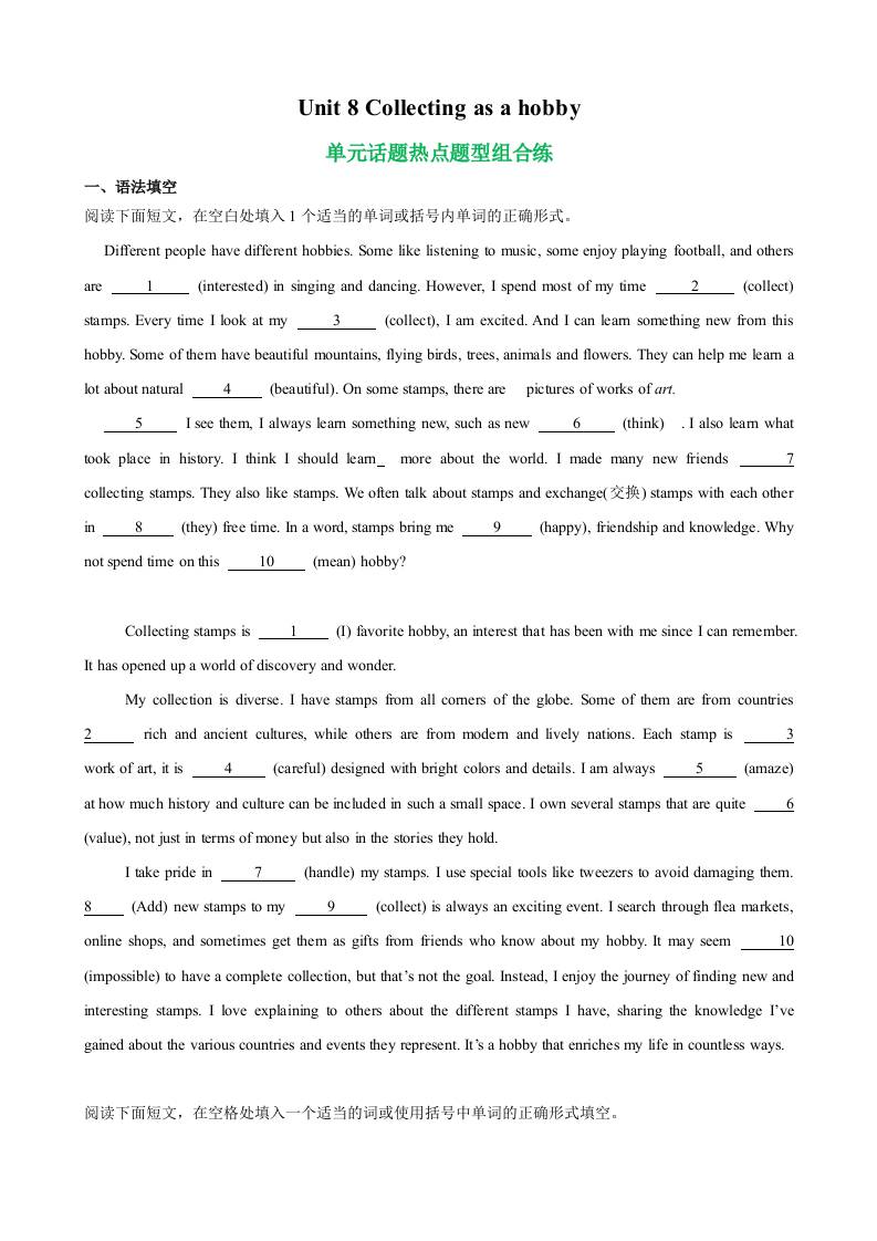 Unit 8 Collecting as a hobby单元话题练(语法填空阅读完形写作)(原卷版)