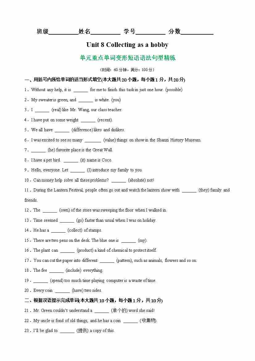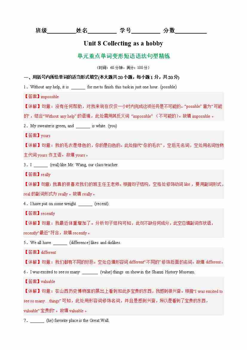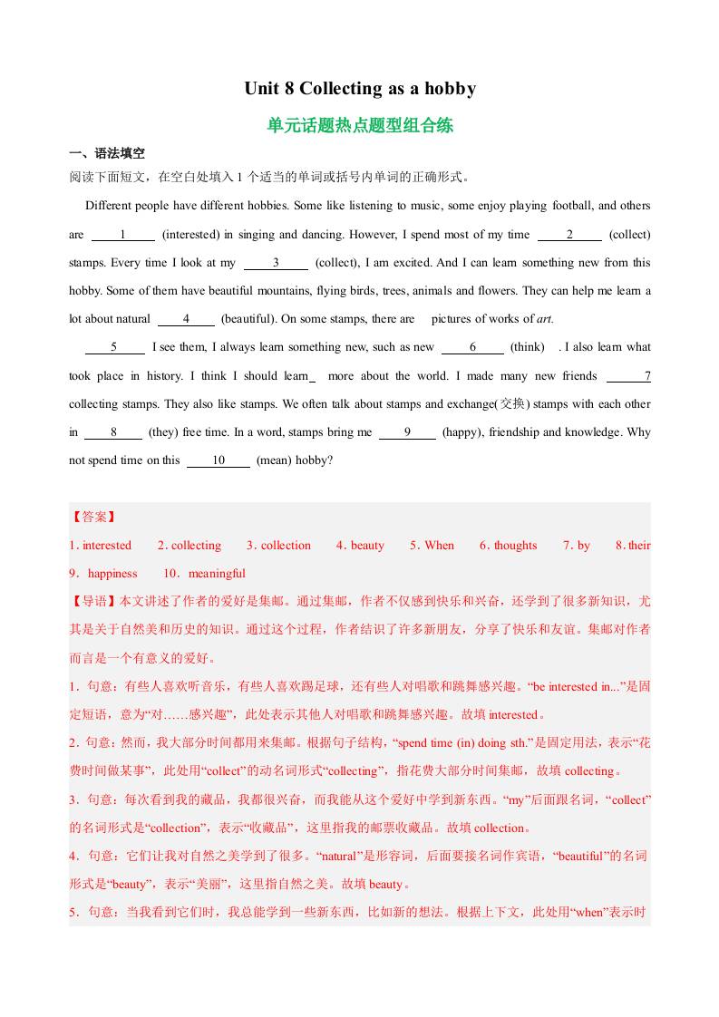 Unit 8 Collecting as a hobby重点单词,词性转换,短语,语法,句型练习(解析版)