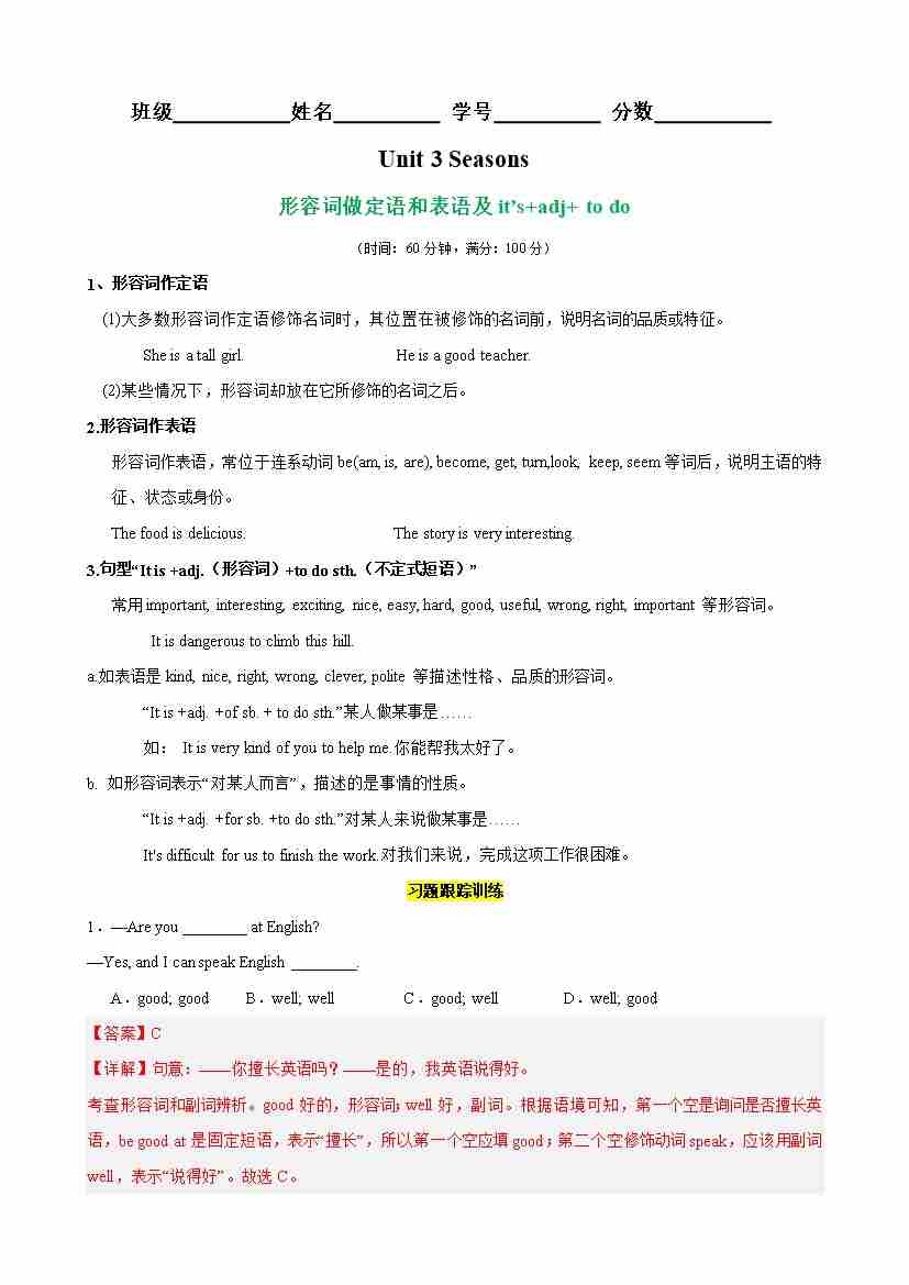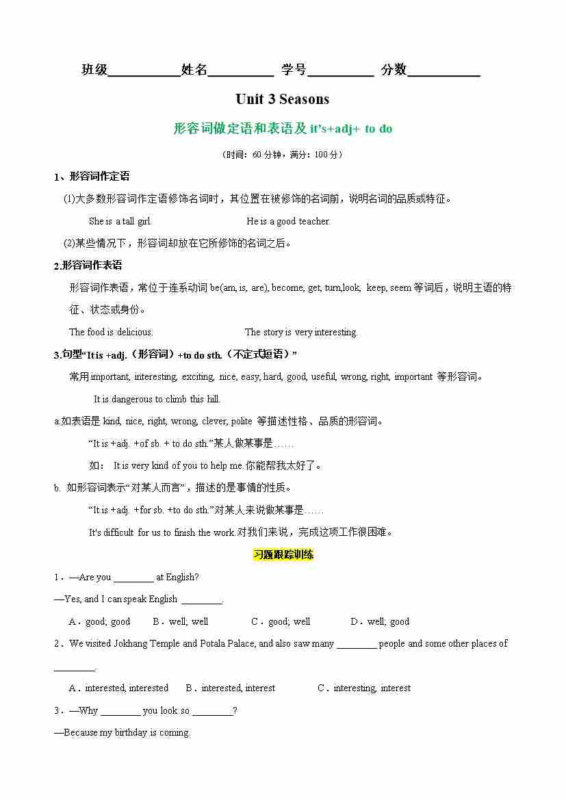 Unit 3 Seasons 语法Grammar 形容词做定语和表语(教师版)