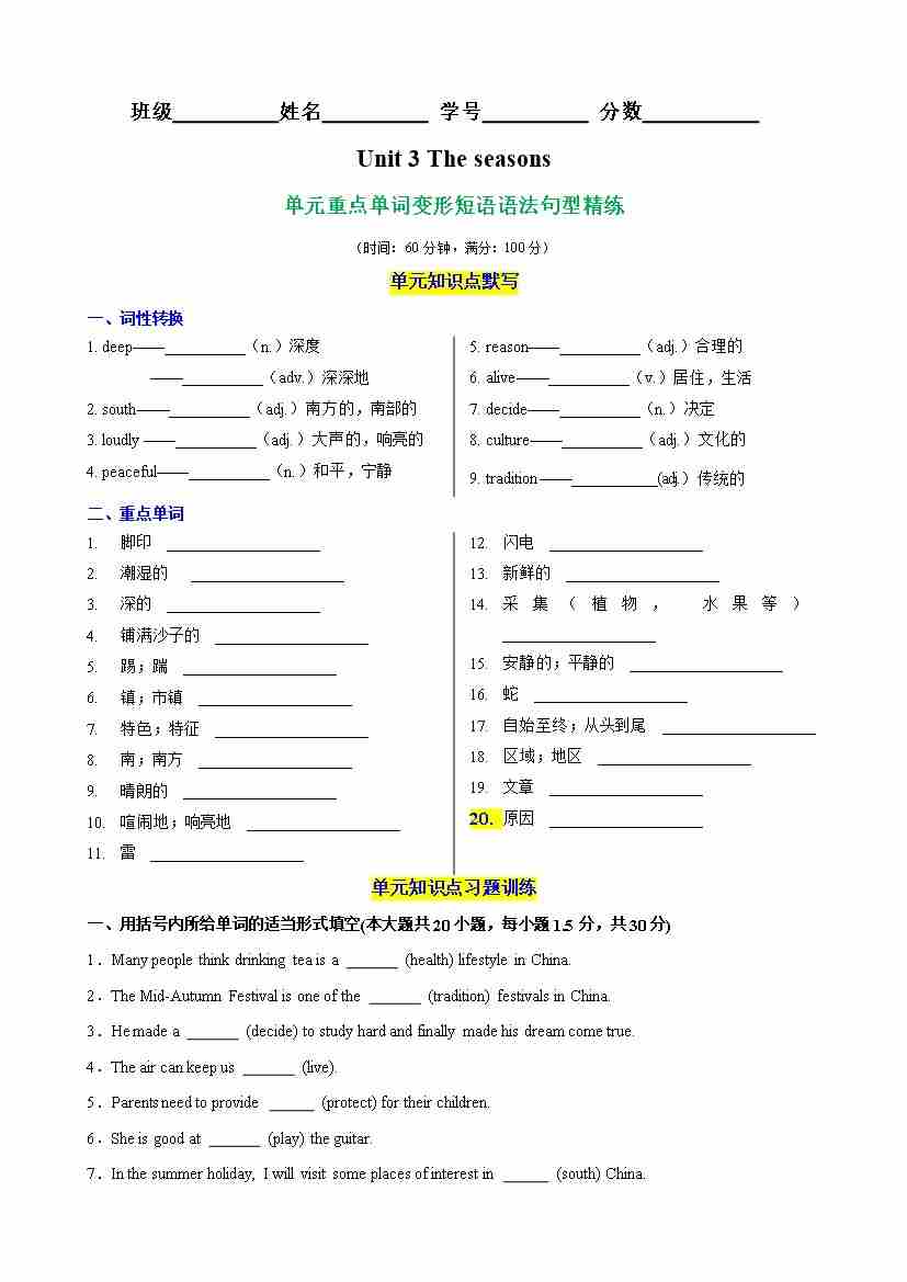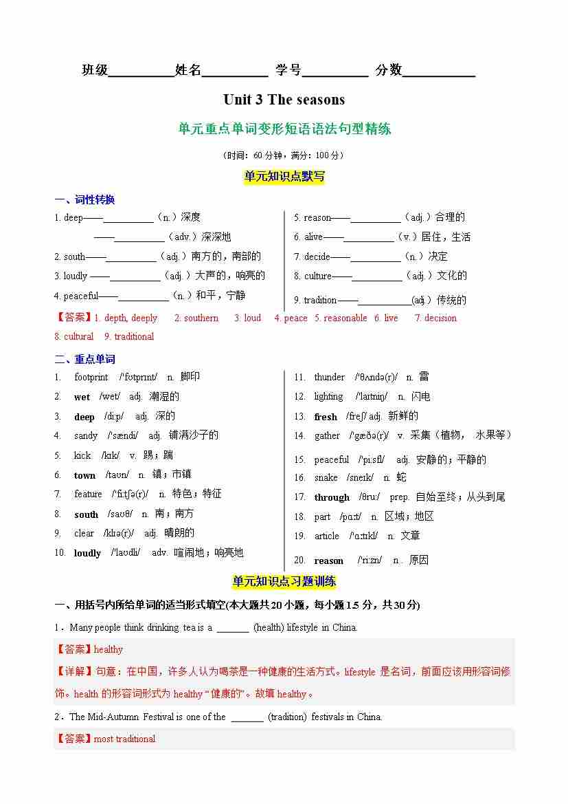 Unit 3 The seasons单元核心单词,词性转换,短语,语法,句型精练(解析版)