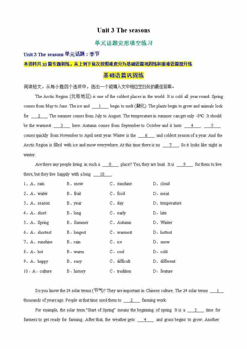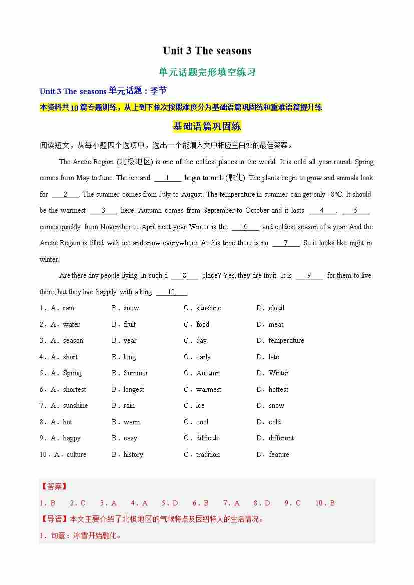 Unit 3 The seasons单元话题完形填空练习(学生版)