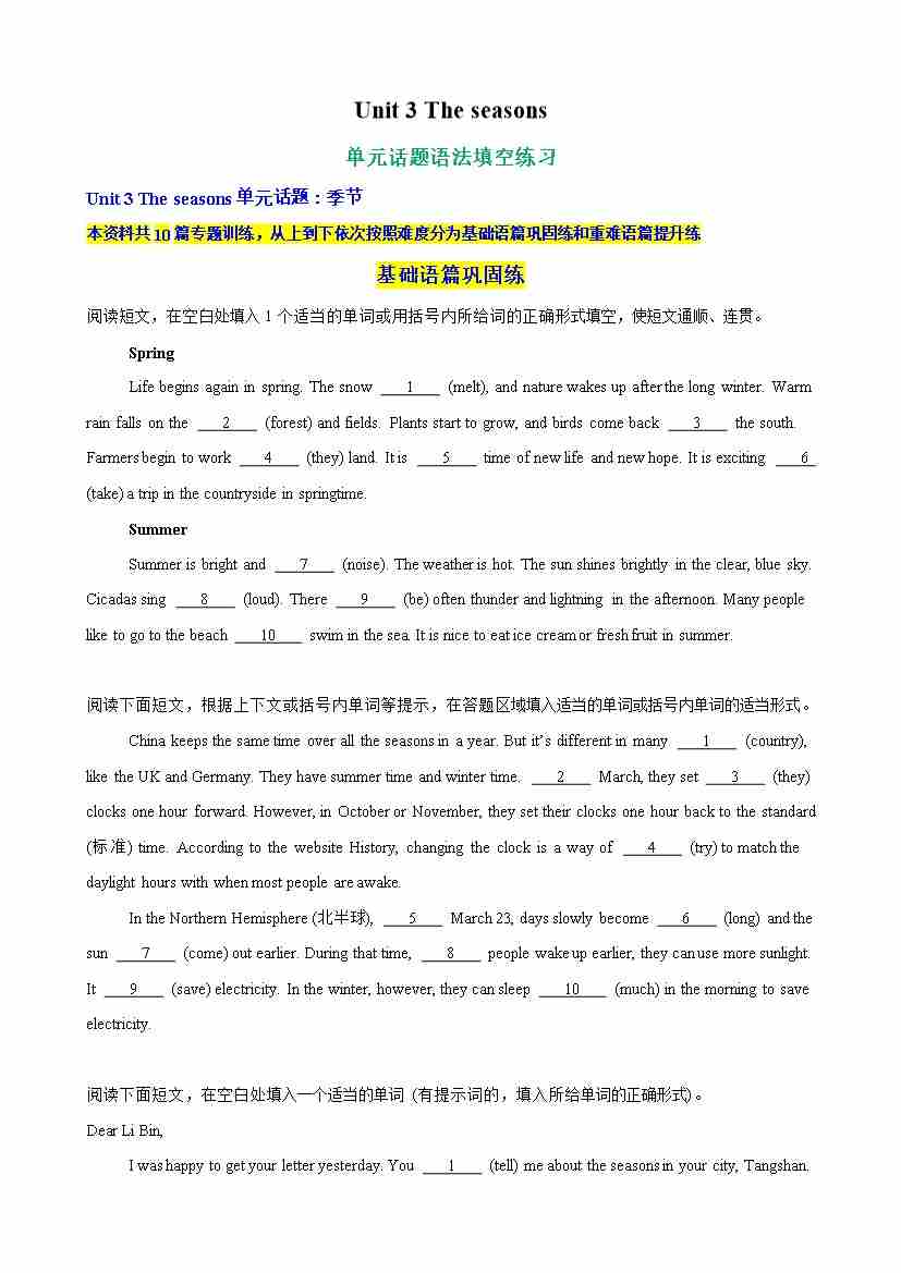 Unit 3 The seasons单元话题语法填空练习(学生版)