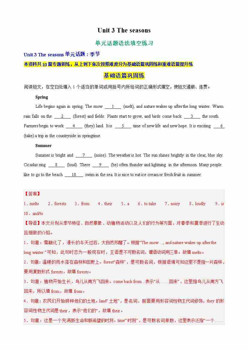 Unit 3 The seasons单元话题语法填空练习(教师版)
