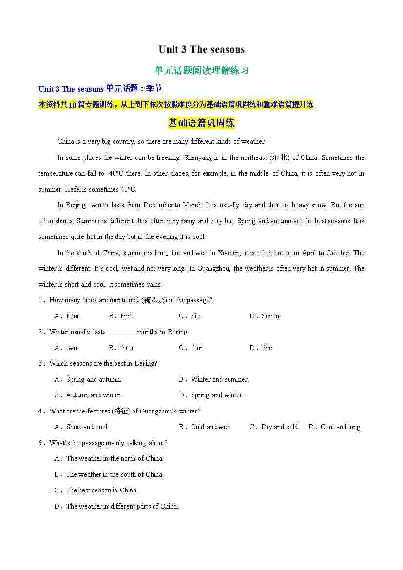 Unit 3 The seasons单元话题阅读理解练习(学生版)