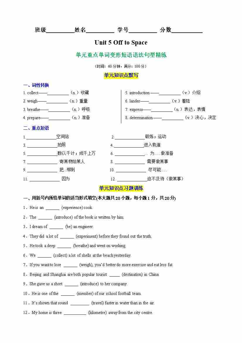 Unit 5 Off to Space单元重点单词,词性转换,短语,语法,句型精练(学生版)