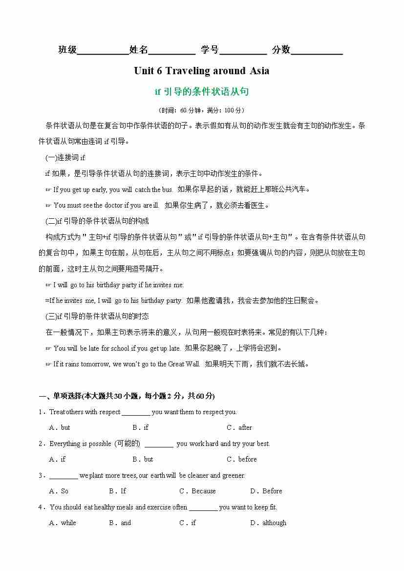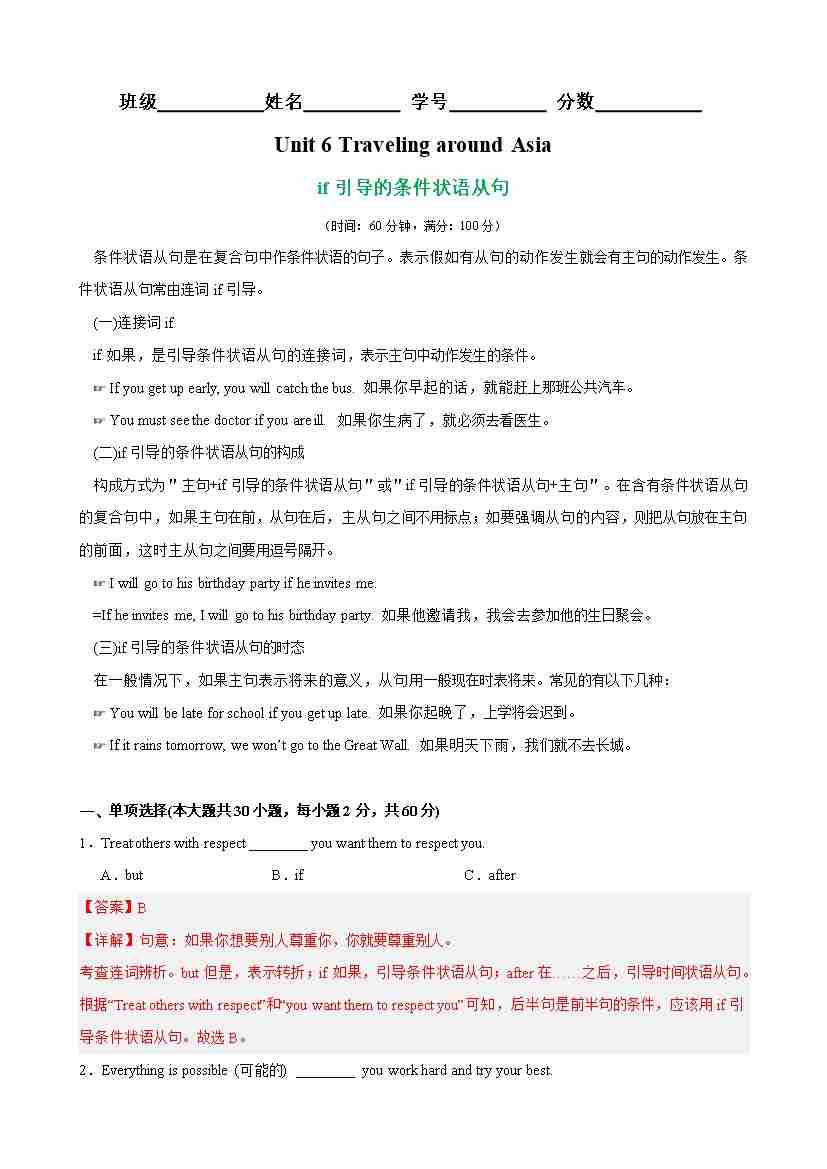 Unit 6 Traveling around Asia 语法Grammar if引导的条件状语从句(教师版)