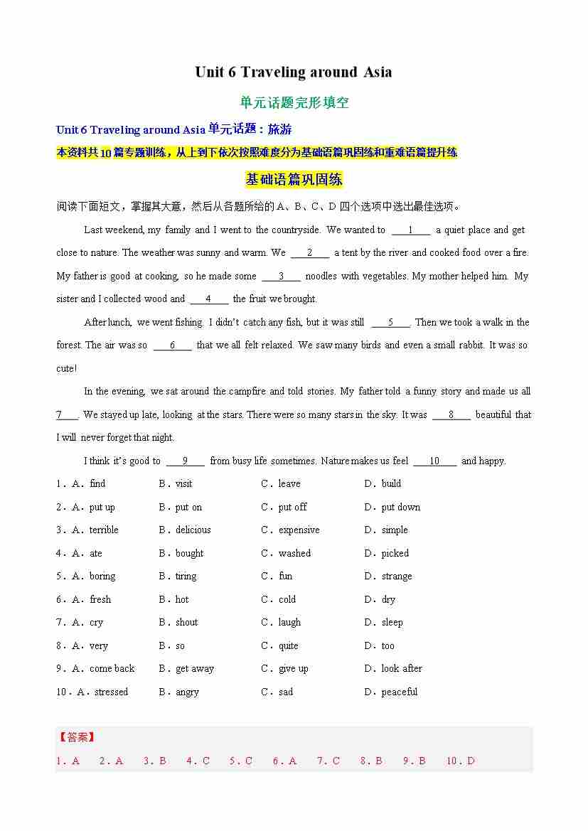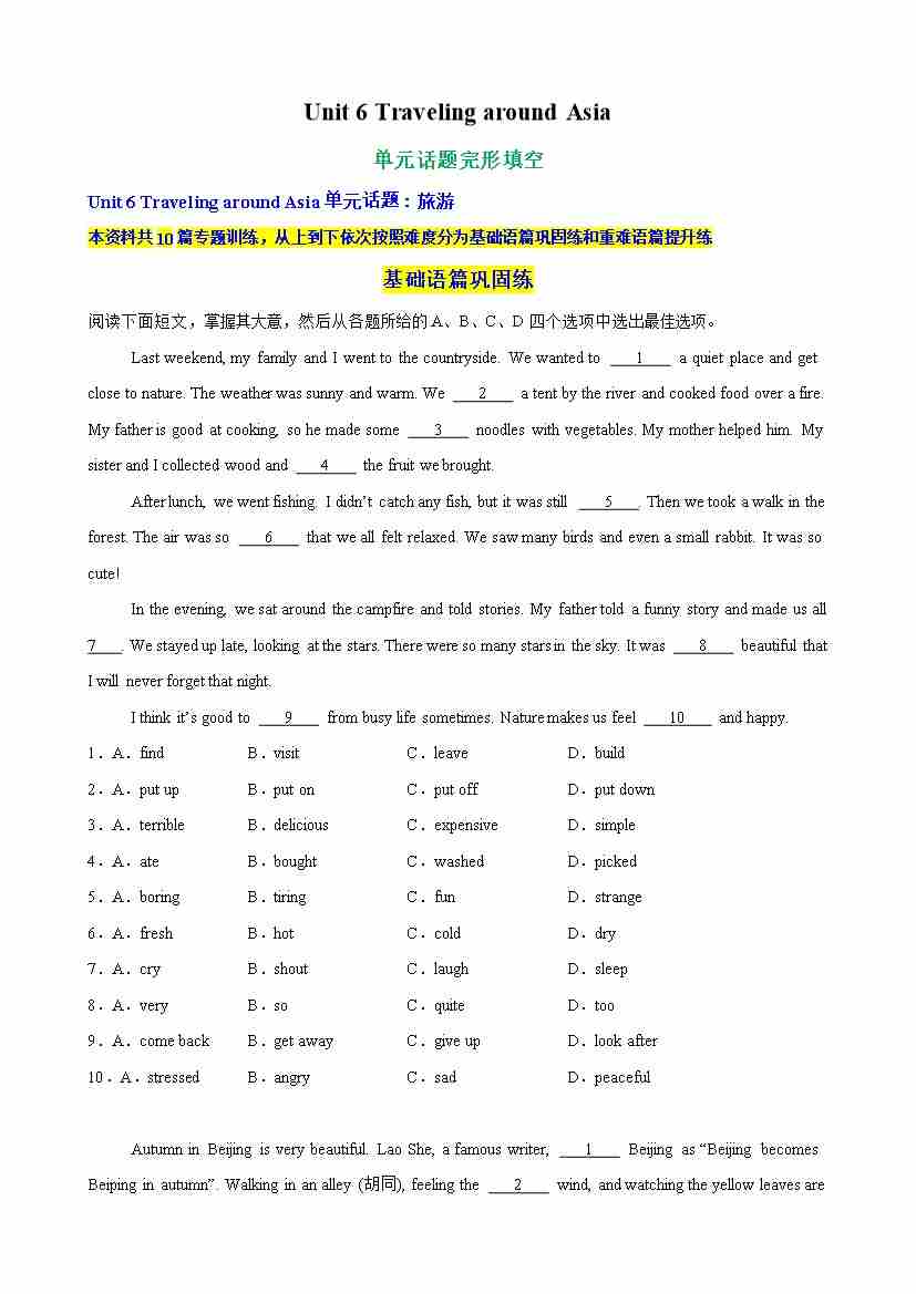 Unit 6 Traveling around Asia单元话题完形填空练习(学生版)