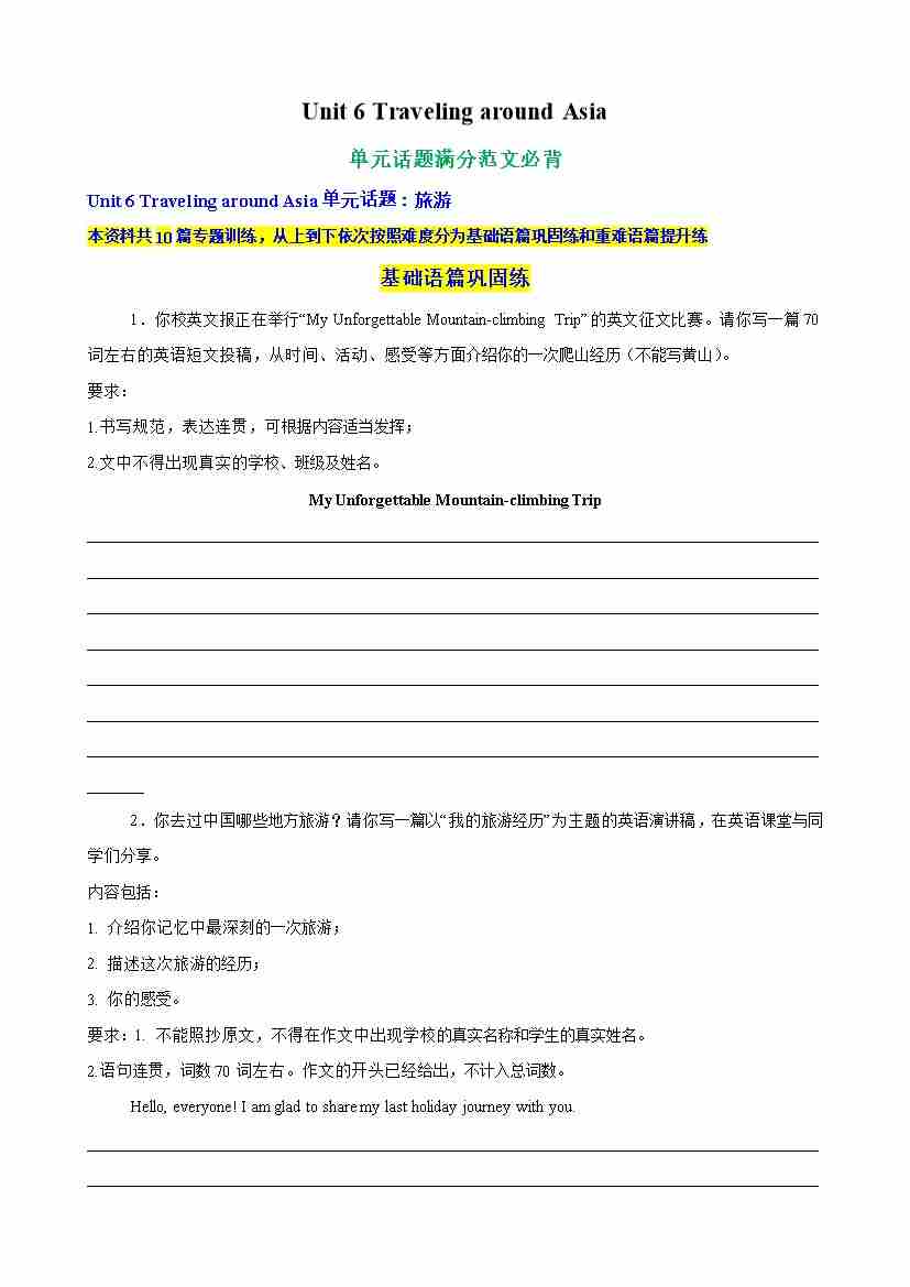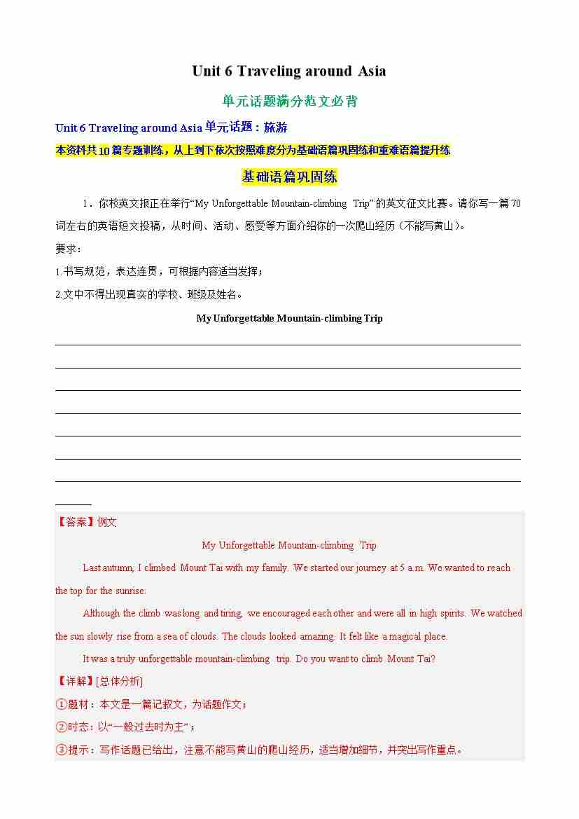 Unit 6 Traveling around Asia单元话题满分范文必背(教师版)