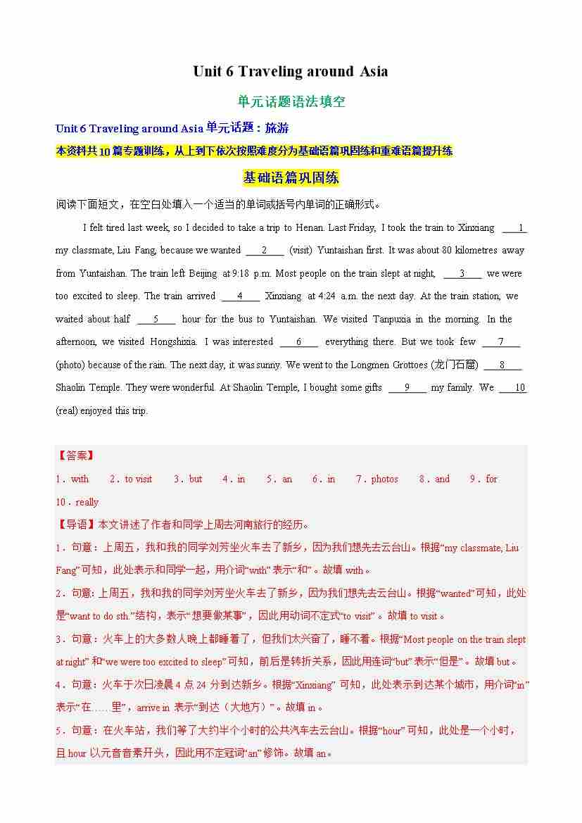 Unit 6 Traveling around Asia单元话题语法填空练习(教师版)