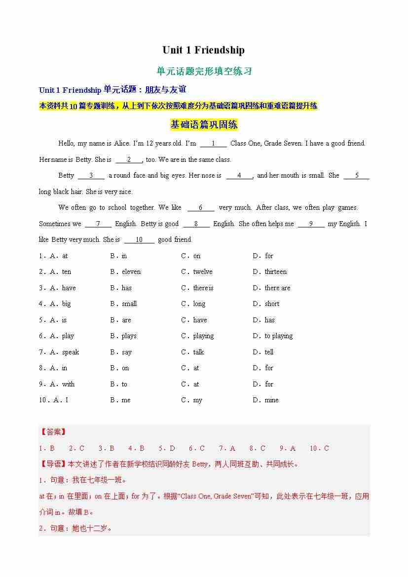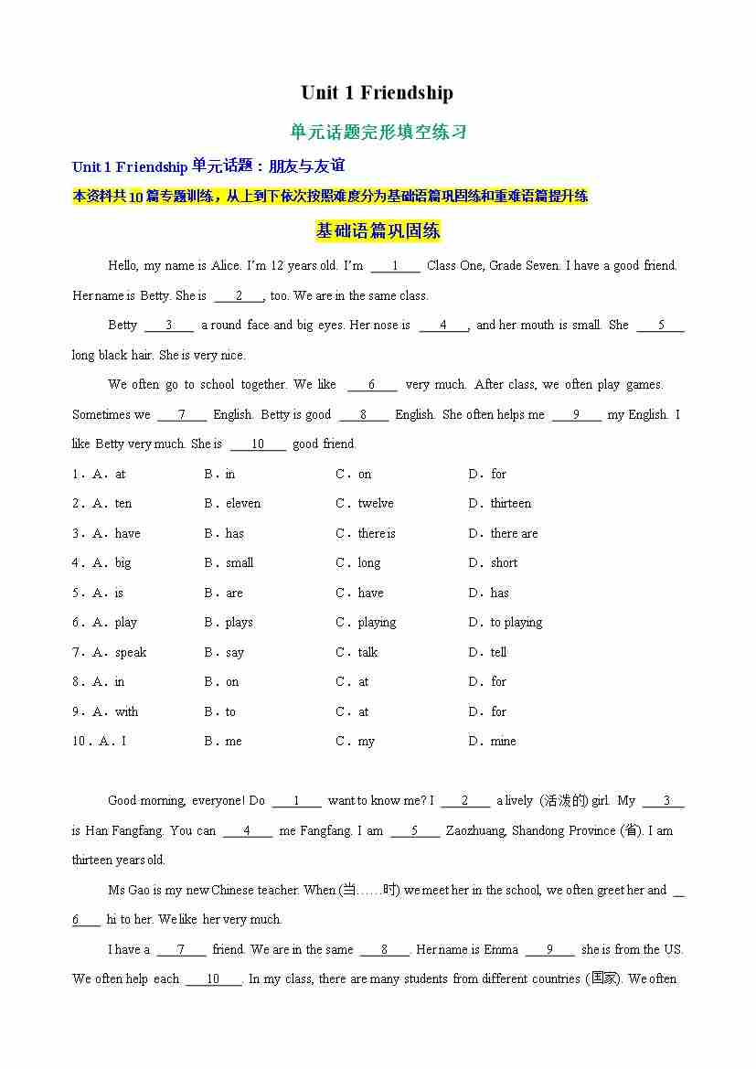 Unit 1 Friendship 单元话题完形填空练习(学生版)