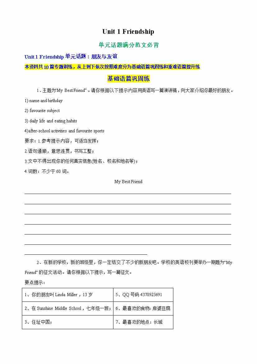 Unit 1 Friendship 单元话题满分范文必背(学生版)