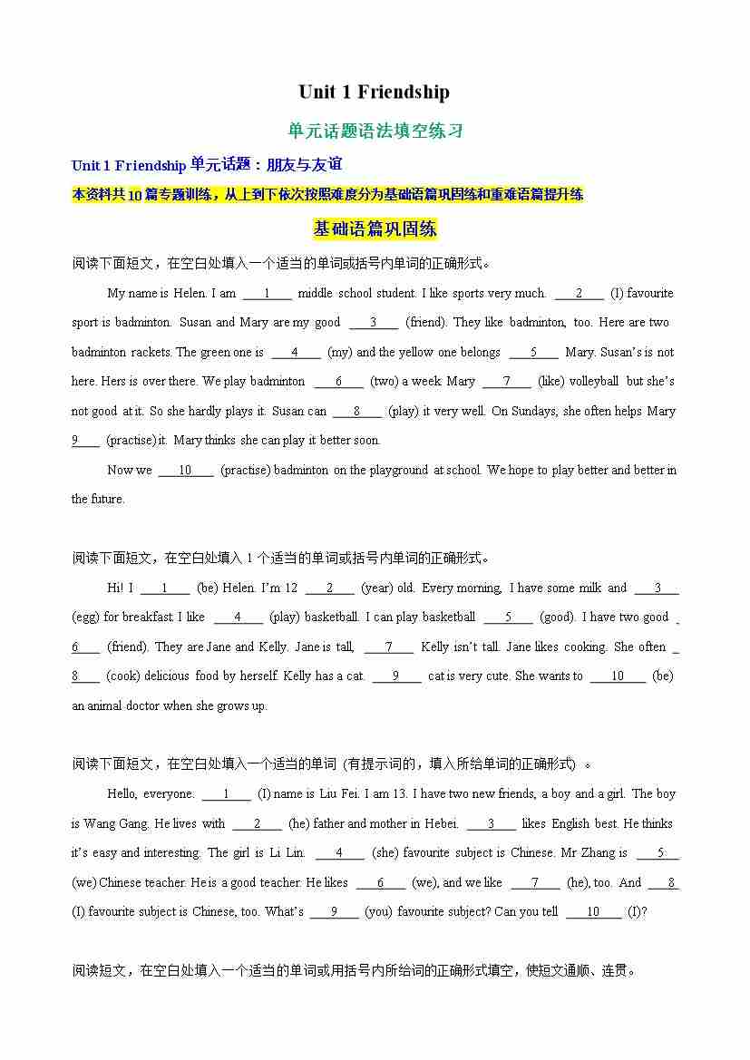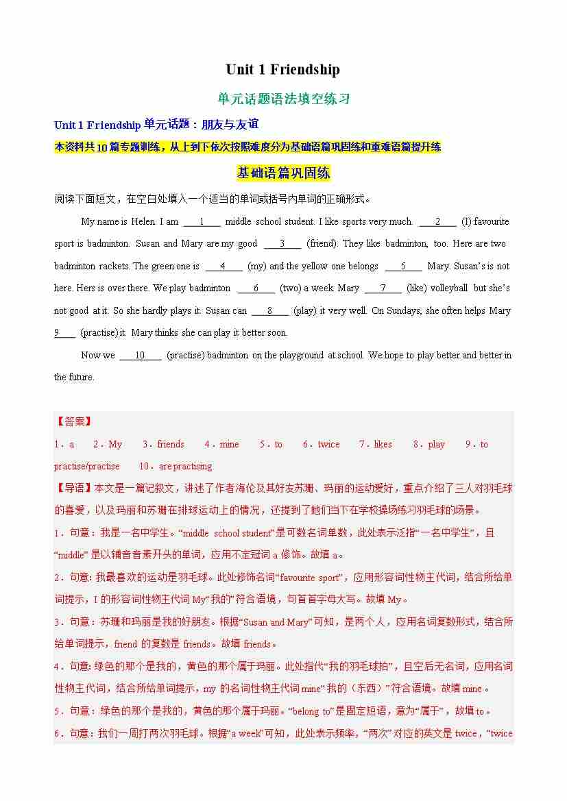 Unit 1 Friendship 单元话题语法填空练习(学生版)