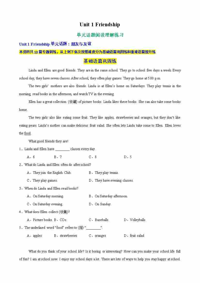 Unit 1 Friendship 单元话题阅读理解练习(学生版)