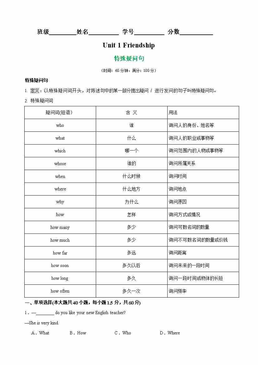 Unit 1 Friendship 单元语法Grammar 特殊疑问句(学生版)