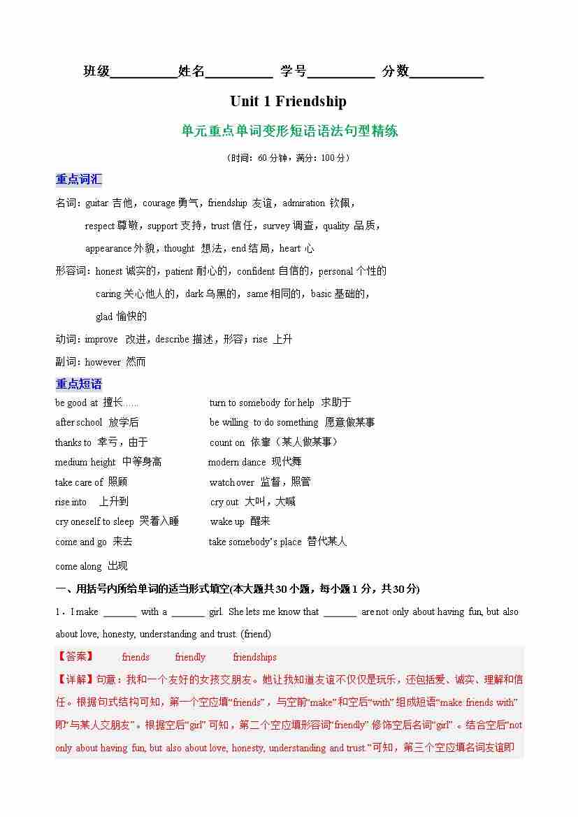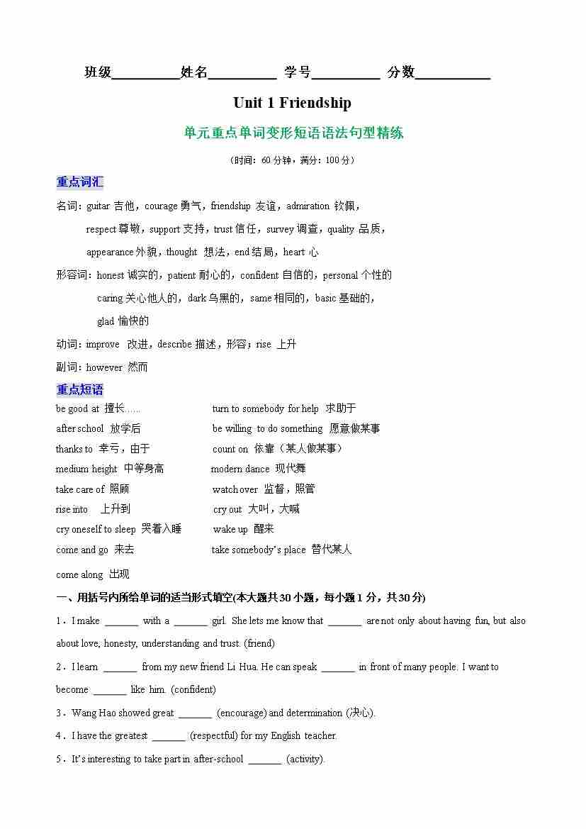 Unit 1 Friendship 单元重点单词变形短语语法句型精练(教师版)