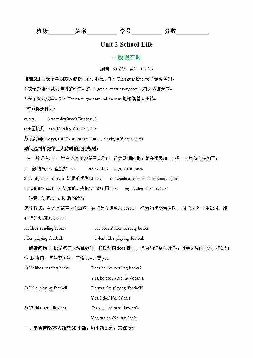 Unit 2 School Life 语法Grammar 一般现在时(教师版)