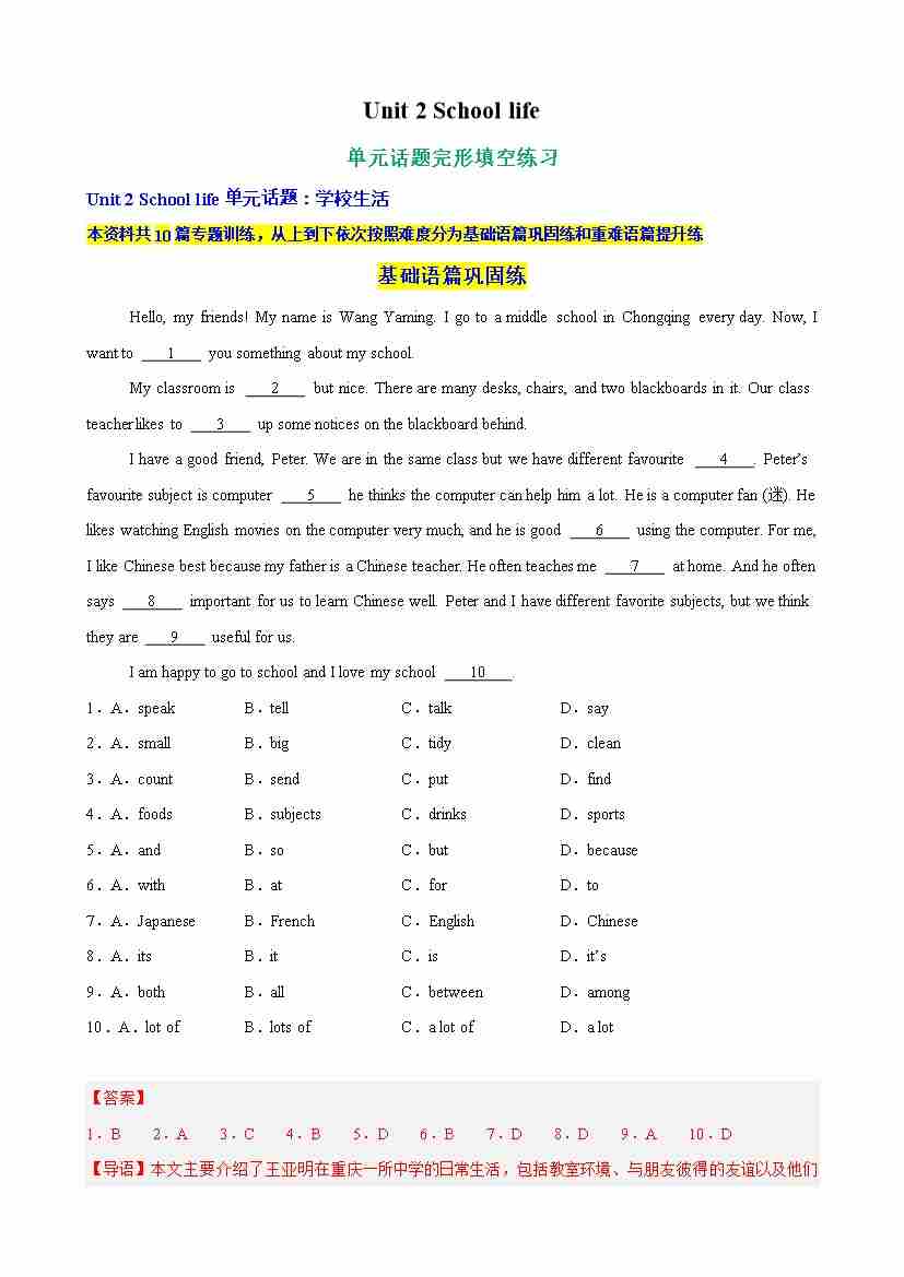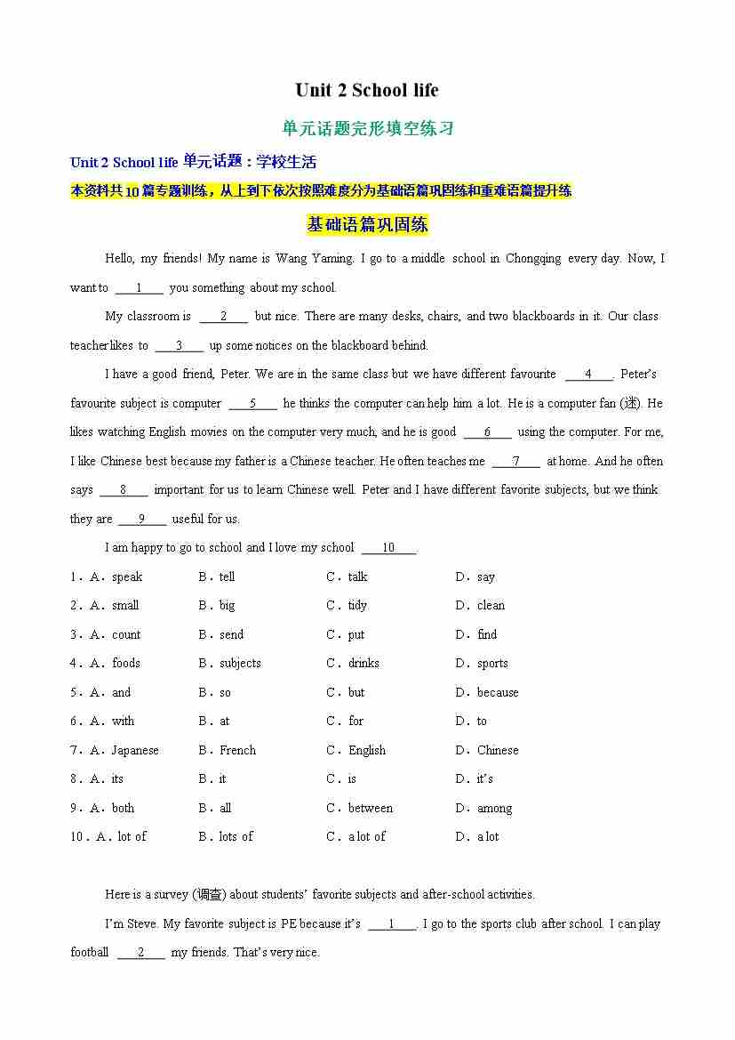 Unit 2 School life 单元话题完形填空练习(学生版)