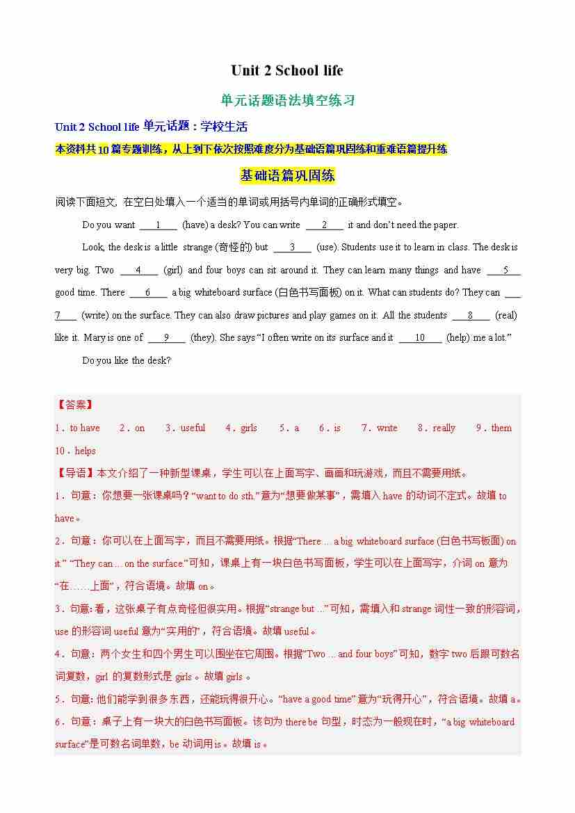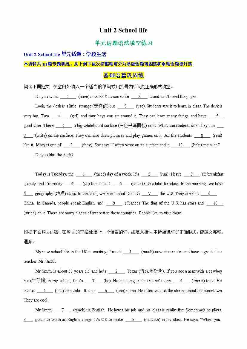 Unit 2 School life 单元话题语法填空练习(学生版)