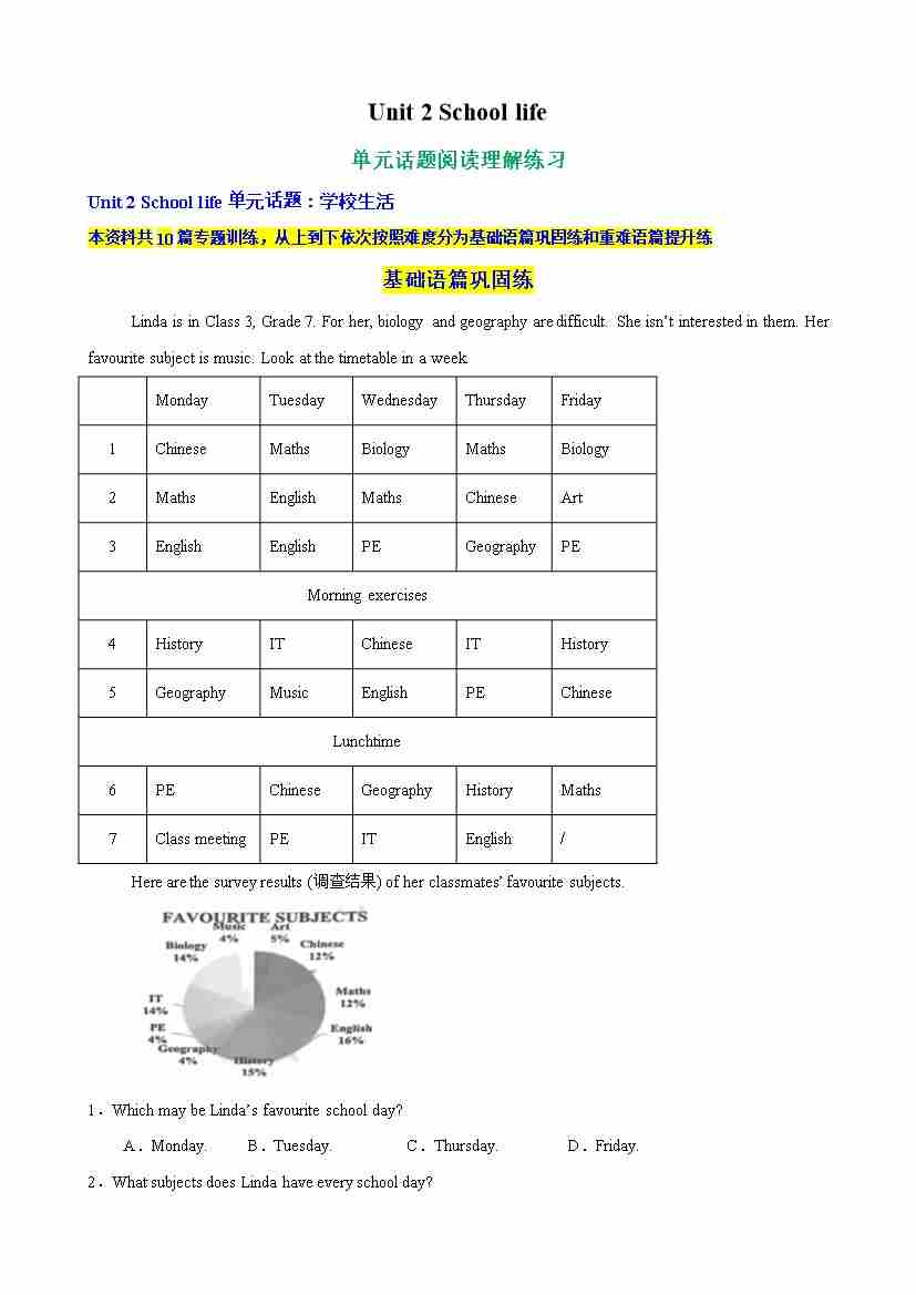 Unit 2 School life 单元话题阅读理解练习(学生版)
