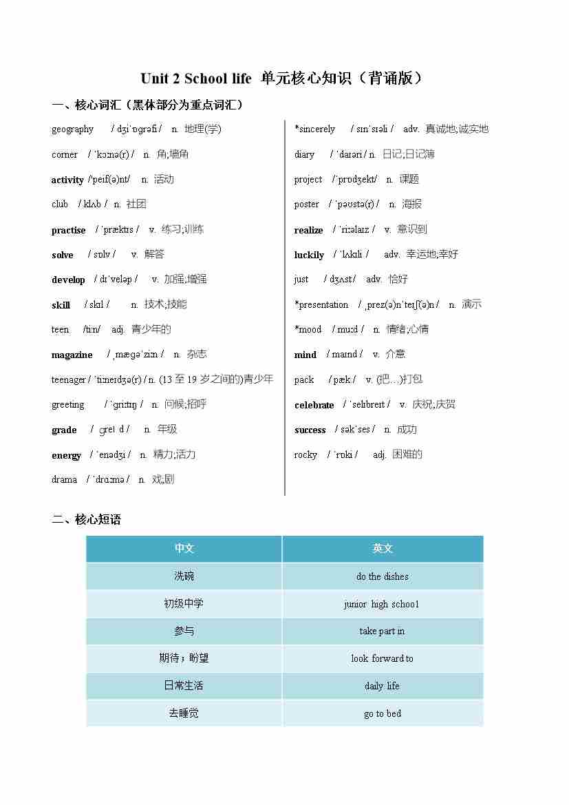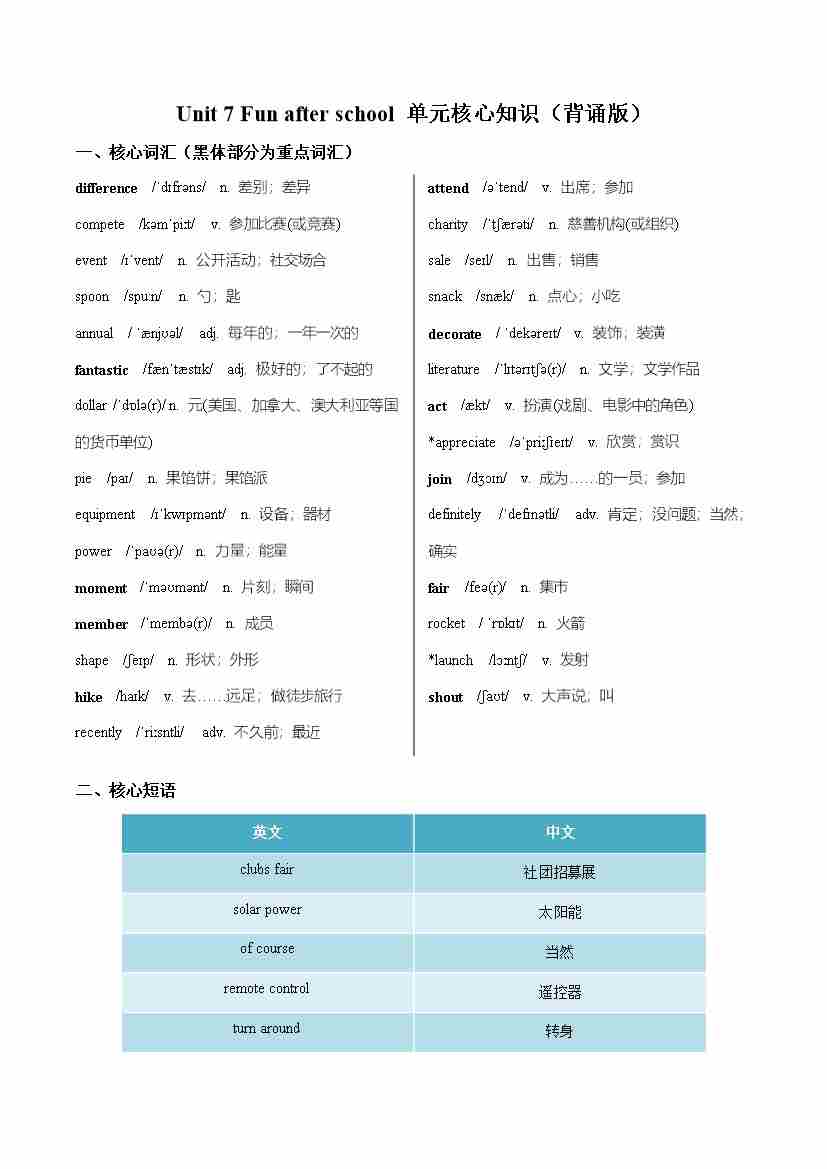 Unit 7 Fun after school(单元核心知识)(背诵版)