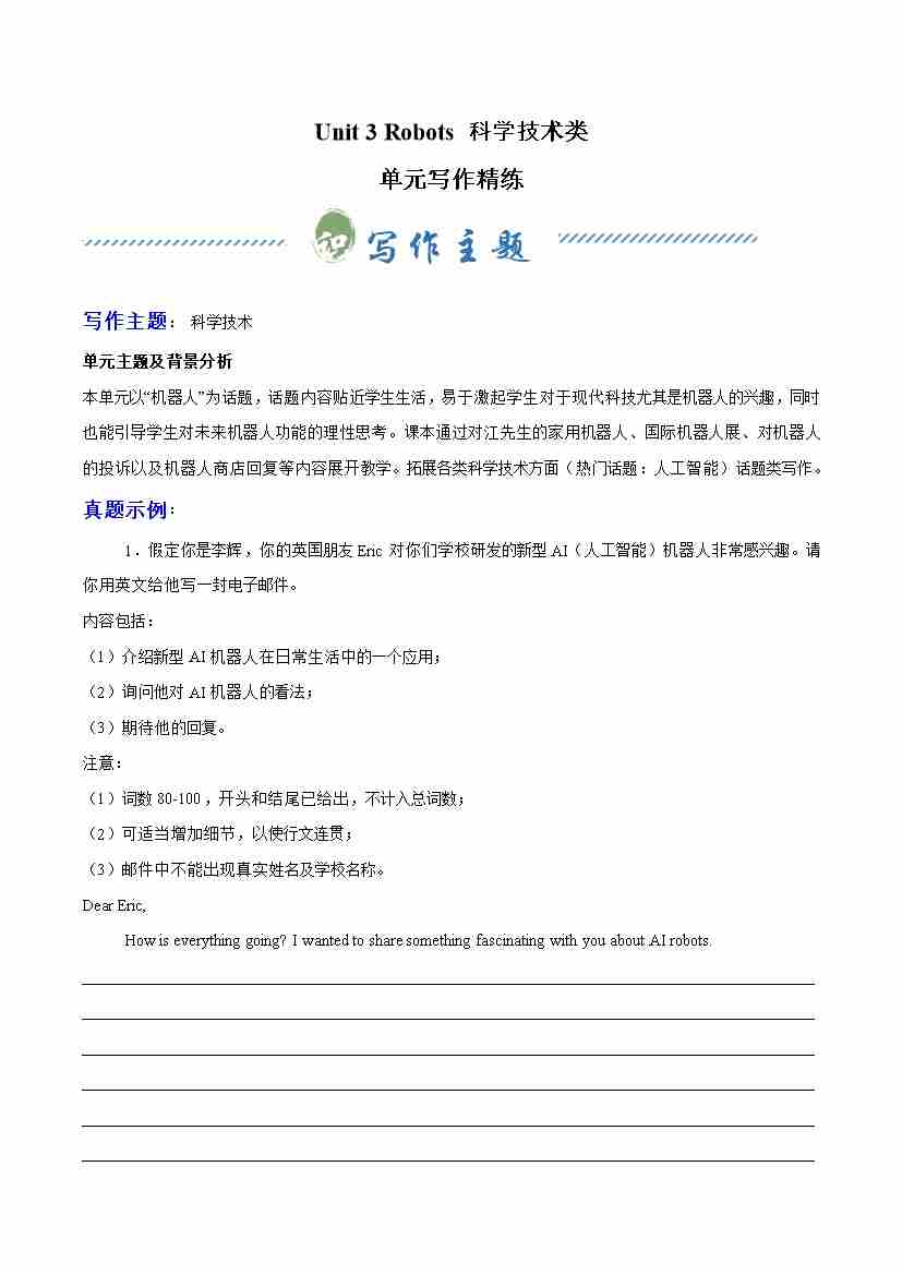Unit 3 Robots 科学技术类(单元写作精练)(原卷版)