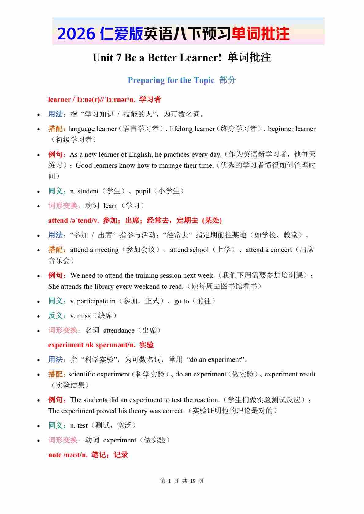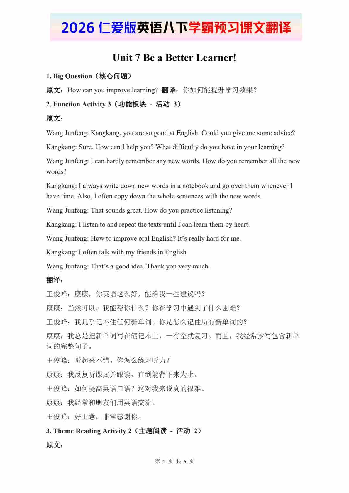 2026仁爱版英语八下课文原文和翻译Unit 7