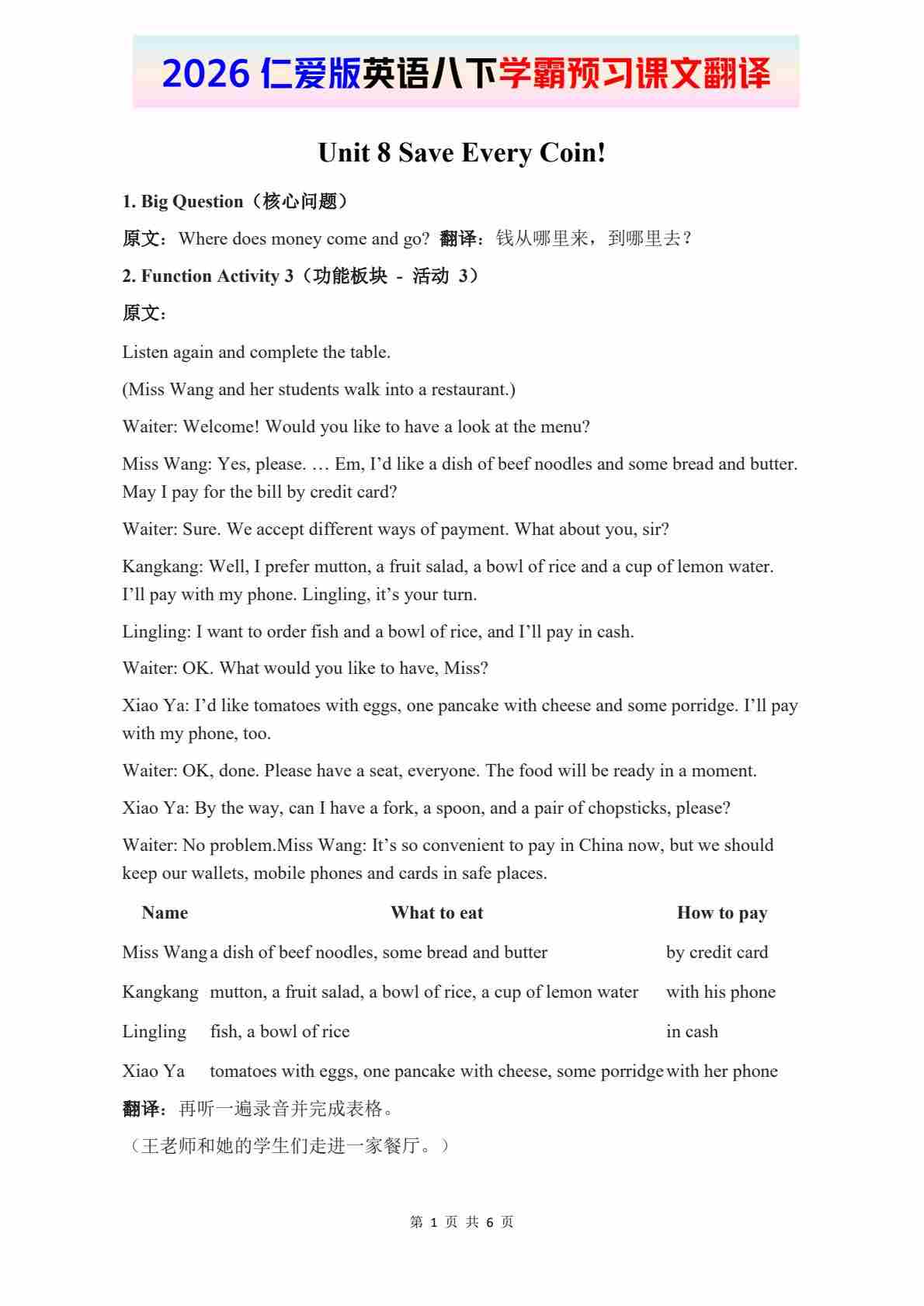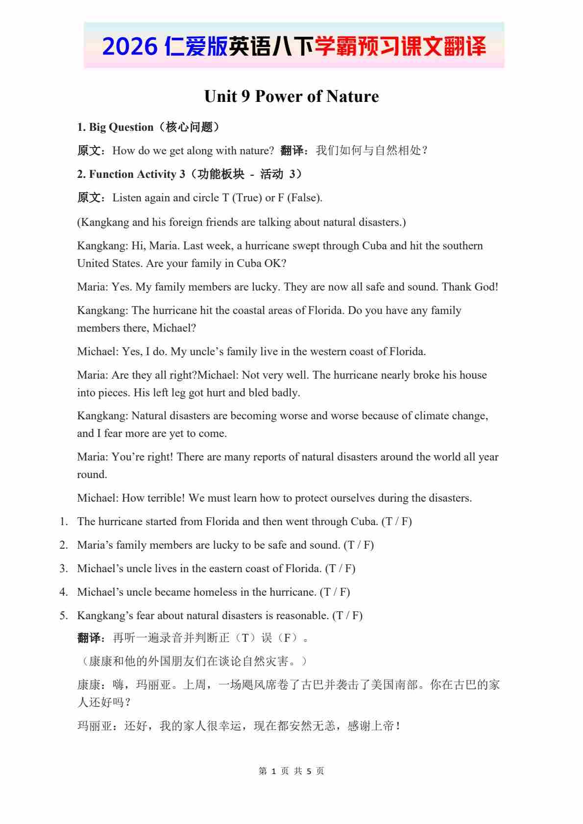 2026仁爱版英语八下课文原文和翻译Unit 8
